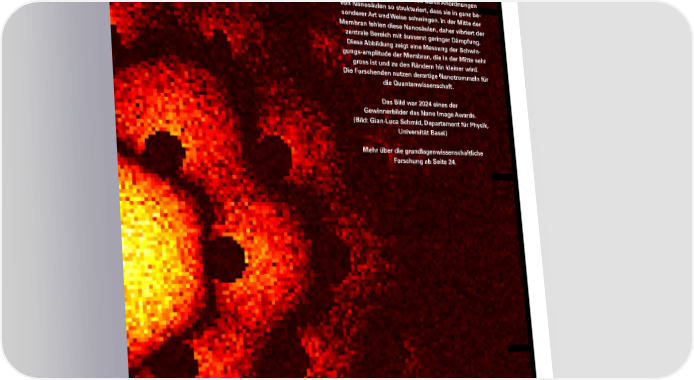 250 Schwingende Nanotrommel Winzige Membranen werden durch Anordnungen von Nanosäulen so strukturiert, dass sie in ganz be sonderer Art und Weise schwingen. In der Mitte der 200 Membran fehlen diese Nanosäulen, daher vibriert der zentrale Bereich mit äusserst geringer Dämpfung. Diese Abbildung zeigt eine Messung der Schwin gungsamplitude der Membran, die in der Mitte sehr gross ist und zu den Rändern hin kleiner wird. Die Forschenden nutzen derartige Nanotrommeln für die Quantenwissenschaft. Das Bild war 2024 eines der Gewinnerbilder das Nano Image Awards. (Bild: GianLuca Schmid, Departement für Physik, Universität Basel) Mehr über die grundlagenwissenschaftliche 150 Forschung ab Seite 24. 100 50 SNI-Jahresbericht 2024 23 0