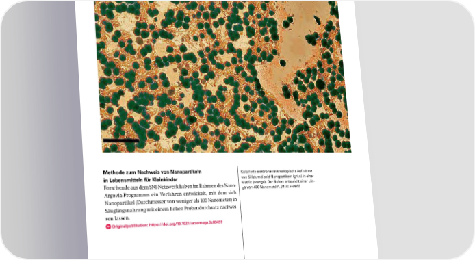 Methode zum Nachweis von Nanopartikeln Kolorierte elektronenmikroskopische Aufnahme in Lebensmitteln für Kleinkinder von Siliziumdioxid-Nanopartikeln (grün) in einer Forschende aus dem SNI-Netzwerk haben im Rahmen des Nano- Matrix (orange). Der Balken entspricht einer Län- ge von 400 Nanometern. (Bild: FHNW) Argovia-Programms ein Verfahren entwickelt, mit dem sich Nanopartikel (Durchmesser von weniger als 100 Nanometer) in Säuglingsnahrung mit einem hohen Probendurchsatz nachwei- sen lassen. Originalpublikation: https://doi.org/10.1021/acsomega.3c09459 26 SNI-Jahresbericht 2024