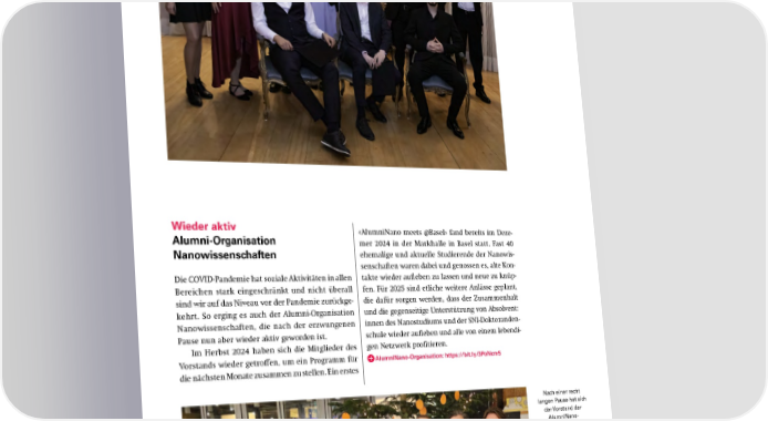 Der krönende Ab- schluss des Studiums Nanowissenschaften an der Universität Ba- sel ist seit ein paar Jahren die Masterfeier im Wild‘schen Haus. (Bild: K. Schad) Wieder aktiv «AlumniNano meets @Basel» fand bereits im Deze- AlumniOrganisation mer 2024 in der Markhalle in Basel statt. Fast 40 Nanowissenschaften ehemalige und aktuelle Studierende der Nanowis- senschaften waren dabei und genossen es, alte Kon- Die COVID-Pandemie hat soziale Aktivitäten in allen takte wieder aufleben zu lassen und neue zu knüp- Bereichen stark eingeschränkt und nicht überall fen. Für 2025 sind etliche weitere Anlässe geplant, sind wir auf das Niveau vor der Pandemie zurückge- die dafür sorgen werden, dass der Zusammenhalt kehrt. So erging es auch der Alumni-Organisation und die gegenseitige Unterstützung von Absolvent: Nanowissenschaften, die nach der erzwungenen innen des Nanostudiums und der SNI-Doktoranden- Pause nun aber wieder aktiv geworden ist. schule wieder aufleben und alle von einem lebendi- Im Herbst 2024 haben sich die Mitglieder des gen Netzwerk profitieren. Vorstands wieder getroffen, um ein Programm für AlumniNanoOrganisation: https://bit.ly/3PoNcm5 die nächsten Monate zusammen zu stellen. Ein erstes Nach einer recht langen Pause hat sich der Vorstand der AlumniNano- Organisation neu formiert und ein Programm für die nächsten Monate erstellt. (Bild: Alumni- Nano) SNI-Jahresbericht 2024 13