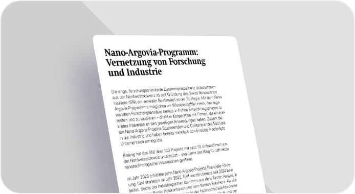 Nano-Argovia-Programm: Vernetzung von Forschung und Industrie Die enge, forschungsorientierte Zusammenarbeit mit Unternehmen aus der Nordwestschweiz ist seit Gründung des Swiss Nanoscience Institute (SNI) ein zentraler Bestandteil seiner Strategie. Mit dem Nano- Argovia-Programm ermöglichen wir Wissenschaftler:innen, ihre ange- wandten Forschungsansätze bereits in frühen Entwicklungsphasen zu testen und zu validieren – direkt in Kooperation mit Firmen, die ein kon- kretes Interesse an den jeweiligen Anwendungen haben. Zudem bie- ten Nano-Argovia-Projekte Studierenden und Doktorierenden Einblicke in die Industrie und haben bereits mehrfach den Einstieg in beteiligte Unternehmen ermöglicht. Bislang hat das SNI über 100 Projekte mit rund 70 Unternehmen aus der Nordwestschweiz unterstützt – und damit den Weg für zahlreiche nanotechnologische Innovationen geebnet. Im Jahr 2025 erhielten zehn Nano-Argovia-Projekte finanzielle Förde- rung: fünf starteten im Jahr 2025, fünf werden bereits seit 2024 bear- beitet. Sechs der Industriepartner stammen aus dem Kanton Aargau, je zwei aus den Basler Halbkantonen und dem Kanton Solothurn. Als aka- demische Partner brachten Forschende der Fachhochschule Nordwest- schweiz in Muttenz und Windisch, des Paul Scherrer Instituts und der Universität Basel ihre Expertise in die Projekte ein. Nano Argovia Programm: www.nano argovia.swiss 38 SNI-Jahresbericht 2025