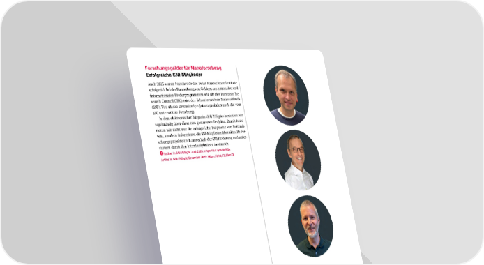 Forschungsgelder für Nanoforschung Erfolgreiche SNI Mitglieder Auch 2025 waren Forschende des Swiss Nanoscience Institute erfolgreich bei der Einwerbung von Geldern aus nationalen und internationalen Förderprogrammen wie die des European Re- search Council (ERC) oder des Schweizerischen Nationalfonds (SNF). Von diesen Drittmittelprojekten profitiert auch die vom SNI unterstützte Forschung. In dem elektronischen Magazin «SNI INSight» berichten wir regelmässig über diese neu gestarteten Projekte. Damit hono- rieren wir nicht nur die erfolgreiche Zusprache von Drittmit- teln, sondern informieren die SNI-Mitglieder über aktuelle For- schungsprojekte auch ausserhalb der SNI-Förderung und unter- stützen damit den interdisziplinären Austausch. Artikel in SNI INSight Juni 2025: https://bit.ly/4c9dRQk Artikel in SNI INSight Dezember 2025: https://bit.ly/3LKkm13 Die Professoren Tomasz Smole ń ski, Tom Ward und Oliver Wenger haben im Jahr 2025 einen ERC Grant zugesprochen be- kommen. Neben diesen drei Forschenden haben auch zahlreiche andere SNI-Mitglie- der Gelder aus nationalen und internationa- len Förderprogrammen bewilligt bekom- men, über die wir in «SNI INSight» berichtet haben. (Bilder: SNI, Photo Vision Neuchâtel, SNI) 65 SNIJahresbericht 2025