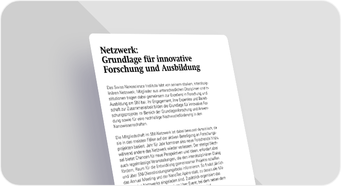 Netzwerk: Grundlage für innovative Forschung und Ausbildung Das Swiss Nanoscience Institute lebt von seinem starken, interdiszip- linären Netzwerk. Mitglieder aus unterschiedlichen Disziplinen und In- stitutionen tragen dabei gemeinsam zur Exzellenz in Forschung und Ausbildung am SNI bei. Ihr Engagement, ihre Expertise und Bereit- schaft zur Zusammenarbeit bilden die Grundlage für innovative For- schungsprojekte im Bereich der Grundlagenforschung und Anwen- dung sowie für eine nachhaltige Nachwuchsförderung in den Nanowissenschaften. Die Mitgliedschaft im SNI-Netzwerk ist dabei bewusst dynamisch, da sie in den meisten Fällen auf der aktiven Beteiligung an Forschungs- projekten basiert. Jahr für Jahr kommen also neue Forschende hinzu, während andere das Netzwerk wieder verlassen. Der stetige Wech- sel bietet Chancen für neue Perspektiven und Ideen, erfordert aber auch regelmässige Veranstaltungen, die den interdisziplinären Dialog fördern, Raum für die Entwicklung gemeinsamer Projekte schaffen und über SNI-Dienstleistungsangebote informieren. So findet jährlich das Annual Meeting und der NanoTec Apéro statt, zu denen alle Mit- glieder des Netzwerks eingeladen sind. Zusätzlich organisiert das Nano Imaging Lab jedes Jahr einen User Event, bei dem neben dem Netzwerk auch externe Partner herzlich willkommen sind. Die verschiedenen Treffen schaffen Räume für persönliche Begegnun- gen, fördern den interdisziplinären Dialog, stärken das Gemein- schaftsgefühl und bieten dem Nano Technology Center eine Plattform sich dem Netzwerk vorzustellen – alles unverzichtbare Voraussetzung für erfolgreiche Zusammenarbeit und die kontinuierliche Weiterent- wicklung des SNI. 62 SNI-Jahresbericht 2025