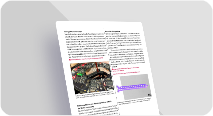 Innovative Röntgenlinse Im Nano-Argovia-Projekt ACHROMATIX haben Forschende erst- mals eine achromatische Röntgenlinse aus einem einzigen Bau- teil entwickelt, die Röntgenstrahlen über einen breiten Ener- giebereich scharf fokussieren kann. Dazu hat das interdiszipli- näre Team zwei bisher getrennte Linsentypen direkt auf einem gemeinsamen Träger integriert, sodass eine aufwendige Aus- richtung entfällt. Die neue Linse erreicht eine sehr hohe Auflösung von etwa 200 Nanometern und funktioniert für einen weiten Energiebe- reich. Sie hat sich bereits in verschiedenen Röntgenmikrosko- pie- und Spektroskopie-Verfahren bewährt und besitzt grosses Potenzial für den breiten Einsatz in der Röntgenbildgebung. Die Forschenden haben ihre Ergebnisse in den Wissenschafts- magazinen «Optics Express» und «Photonics Research» veröf- fentlicht. Originalpublikationen: https://opg.optica.org/oe/fulltext. cfm?uri=oe 33 12 26578 https://www.researching.cn/Articles/OJb3d672085c7e2a4e Winzige Magnetsensoren Innerhalb des Nano-Argovia-Projekts NanoHighSens haben For- schende der Hochschule für Life Sciences FHNW Magnetsenso- ren im Nanometerbereich entwickelt. Diese Sensoren können Magnetfelder schnell, genau und mit sehr wenig Energie mes- sen und sind dank ihrer einfachen Elektronik für eine spätere Massenproduktion geeignet. Die in dem Wissenschaftsjournal «IEEE Sensors Journal» veröffentlichten Experimente zeigen, dass die Sensoren zu den kleinsten ihrer Art gehören und künf- tig in Industrie und Biowissenschaften eingesetzt werden könn- ten – beispielsweise zum Nachweis magnetischer Partikel. Originalpublikation: https://doi.org/10.1109/jsen.2025.3537700 Im Nano-Argovia-Projekt NanoHighSens haben Forschende Magnetsenso- ren im Nanometerbereich entwickelt. (Bild: J. Pascal und H. Nicolas, FHNW) Strukturaufklärung von Membranproteinen mithilfe der Elektronenbeugung Ein interdisziplinäres Team aus dem SNI-Netzwerk hat im Rah- men des Nano-Argovia-Programms entscheidende Fortschritte in der Anwendung der Elektronenbeugung an 3D-Mikrokristal- len (3D ED/MicroED) erzielt. Die Ergebnisse wurden im «Biophy- sical Journal» veröffentlicht und zeigen insbesondere das Po- tenzial der Methode für die Strukturaufklärung von Membran- proteinen – einer Klasse von Proteinen, die für die Entwicklung von Medikamenten von zentraler Bedeutung sind, sich aber oft schwer analysieren lassen. Originalpublikation: https://doi.org/10.1016/j.bpj.2025.10.027 Die Elektronenbeugung birgt grosses Potenzial bei der Strukturaufklärung von Membranproteinen. (Bild: V. Panneels, Paul Scherrer Institut PSI) Rasterelektronenmikroskopische Aufnahme der monolithischen achromati- schen Röntgenlinse. (Bild: J. Vila-Comamala, Paul Scherrer Institut PSI) 35 SNIJahresbericht 2025