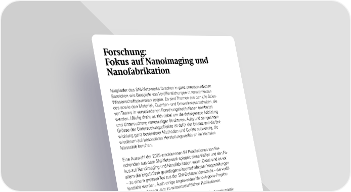 Forschung: Fokus auf Nanoimaging und Nanofabrikation Mitglieder des SNI-Netzwerks forschen in ganz unterschiedlichen Bereichen wie Beispiele von Veröffentlichungen in renommierten Wissenschaftsjournalen zeigen. Es sind Themen aus den Life Scien- ces sowie den Material-, Quanten- und Umweltwissenschaften, die von Teams in verschiedenen Forschungsinstitutionen bearbeitet werden. Häufig dreht es sich dabei um die detailgenaue Abbildung und Untersuchung nanoskaliger Strukturen. Aufgrund der geringen Grösse der Untersuchungsobjekte ist dafür der Einsatz und die Ent- wicklung ganz besonderer Methoden und Geräte notwendig, die wiederum auf besonderen Herstellungsverfahren im kleinsten Massstab beruhen. Eine Auswahl der 2025 erschienenen 94 Publikationen von For- schenden aus dem SNI-Netzwerk spiegelt diese Vielfalt und den Fo- kus auf Nanoimaging und Nanofabrikation wider. Dabei sind es vor allem die Ergebnisse grundlagenwissenschaftlicher Fragestellungen – zu einem grossen Teil aus der SNI-Doktorandenschule – die veröf- fentlicht wurden. Auch einige angewandte Nano-Argovia-Projekte führten in diesem Jahr zu wissenschaftlichen Publikationen. Durch grundlagenwissenschaftliche und angewandte Forschungsak- tivitäten leisten die SNI-Mitglieder einen wichtigen Beitrag zum Ver- ständnis der Prozesse und Gesetze auf der Nanoebene und schaf- fen damit die Grundlage für Anwendungen zum Wohl unserer Gesellschaft. 24 SNI-Jahresbericht 2025