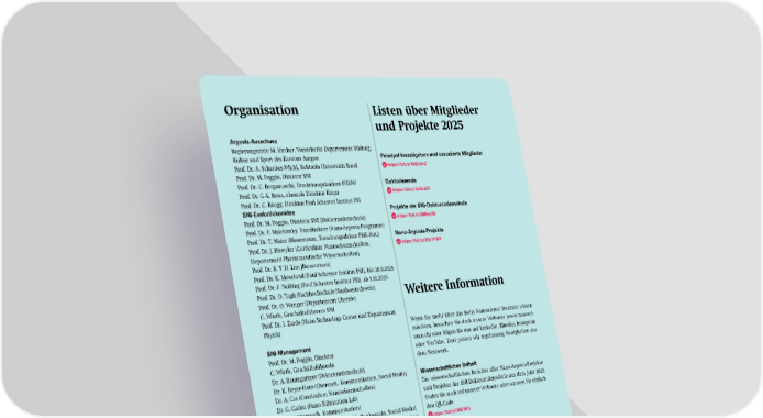 Organisation Argovia Ausschuss Regierungsrätin M. Bircher, Vorsteherin Departement Bildung, Kultur und Sport des Kantons Aargau Prof. Dr. A. Schenker-Wicki, Rektorin Universität Basel Prof. Dr. M. Poggio, Direktor SNI Prof. Dr. C. Bergamaschi, Direktionspräsident FHNW Prof. Dr. G.-L. Bona, ehemals Direktor Empa Prof. Dr. C. Rüegg, Direktor Paul Scherrer Institut PSI SNI Exekutivkomitee Prof. Dr. M. Poggio, Direktor SNI (Doktorandenschule) Prof. Dr. P. Maletinsky, Vizedirektor (Nano-Argovia-Programm) Prof. Dr. T. Maier (Biozentrum, Forschungsdekan Phil.-Nat.) Prof. Dr. J. Huwyler (Curriculum Nanowissenschaften, Departement Pharmazeutische Wissenschaften) Prof. Dr. R. Y. H. Lim (Biozentrum) Prof. Dr. K. Moselund (Paul Scherrer Institut PSI), bis 30.9.2025 Prof. Dr. F. Nolting (Paul Scherrer Institut PSI), ab 1.10.2025 Prof. Dr. O. Tagit (Fachhochschule Nordwestschweiz) Prof. Dr. O. Wenger (Departement Chemie) C. Wirth, Geschäftsführerin SNI Prof. Dr. I. Zardo ( Nano Technology Center und Departement Physik) SNI Management Prof. Dr. M. Poggio, Direktor C. Wirth, Geschäftsführerin Dr. A. Baumgartner (Doktorandenschule) Dr. K. Beyer-Hans (Outreach, Kommunikation, Social Media) Dr. A. Car (Curriculum Nanowissenschaften) Dr. G. Gadea (Nano Fabrication Lab) S. Hüni (Outreach, Kommunikation) Dr. C. Möller (Kommunikation, Medienkontakt, Social Media) Dr. B. Utinger (Outreach, Kommunikation, Industriekontakte) Dr. M. Wyss (Nano Imaging Lab) Curriculum Nanowissenschaften Dr. A. Car (Studienkoordinatorin) S. Chambers (Administration) Nano Imaging Lab Dr. M. Wyss (Leitung, TEM, FIB-SEM) E. Bieler (SEM) S. Erpel (SEM, TEM) Dr. M. Schönenberger (AFM, LSM) Dr. A. Vogel (TEM, FIB-SEM) Nano Fabrication Lab Dr. G. Gadea (Leitung) J. Herzog A. Lücke X. Wildermuth Listen über Mitglieder und Projekte 2025 Principal Investigators und assoziierte Mitglieder https://bit.ly/4b6LXmZ Doktorierende https://bit.ly/4aKbaSP Projekte der SNI Doktorandenschule https://bit.ly/3MEzcXB Nano Argovia Projekte https://bit.ly/3OvTHWY Weitere Information Wenn Sie mehr über das Swiss Nanoscience Institute wissen möchten, besuchen Sie doch unsere Webseite (www.nanosci- ence.ch) oder folgen Sie uns auf LinkedIn, Bluesky, Instagram oder YouTube. Dort posten wir regelmässig Neuigkeiten aus dem Netzwerk. Wissenschaftliches Beiheft Die wissenschaftlichen Berichte aller Nano-Argovia-Projekte und Projekte der SNI-Doktorandenschule aus dem Jahr 2025 finden Sie auch auf unserer Webseite oder scannen Sie einfach den QR-Code. https://bit.ly/3N5YePz 70 SNI-Jahresbericht 2025