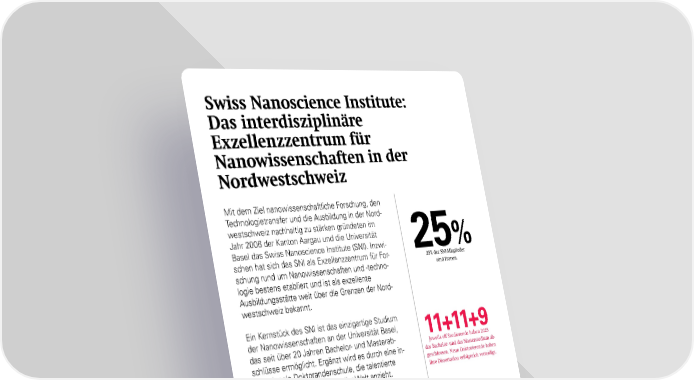 25 % 25% der SNI-Mitglieder sind Frauen. 11+11+9 Jeweils elf Studierende haben 2025 das Bachelor- und das Masterstudium ab- geschlossen. Neun Doktorierende haben ihre Dissertation erfolgreich verteidigt. 41 Zur SNI-Doktorandenschule gehörten im Jahr 2025 41 Doktorierende. Swiss Nanoscience Institute: Das inter disziplinäre Exzellenzzentrum für Nanowissenschaften in der Nordwestschweiz Mit dem Ziel nanowissenschaftliche Forschung, den Technologietransfer und die Ausbildung in der Nord- westschweiz nachhaltig zu stärken gründeten im Jahr 2006 der Kanton Aargau und die Universität Basel das Swiss Nanoscience Institute (SNI). Inzwi- schen hat sich das SNI als Exzellenzzentrum für For- schung rund um Nanowissenschaften und -techno- logie bestens etabliert und ist als exzellente Ausbildungsstätte weit über die Grenzen der Nord- westschweiz bekannt. Ein Kernstück des SNI ist das einzigartige Studium der Nanowissenschaften an der Universität Basel, das seit über 20 Jahren Bachelor- und Masterab- schlüsse ermöglicht. Ergänzt wird es durch eine in- ternationale Doktorandenschule, die talentierte Nachwuchsforschende aus aller Welt anzieht. Die Forschenden im SNI-Netzwerk stammen von verschiedenen akademischen Institutionen in der Nordwestschweiz und arbeiten sowohl an grundla- genorientierten als auch an anwendungsnahen Pro- jekten in Zusammenarbeit mit der Industrie – von den Lebens- über die Quanten- und Material- bis hin zu den Umweltwissenschaften. Besondere Schwer- punkte liegen auf Nanoimaging und Nanofabrikation. Unterstützt werden Forschung und Lehre durch das Nano Technology Center, das mit dem Nano Imaging Lab und dem Nano Fabrication Lab umfassende Ex- pertise in Bildgebung, Oberflächenanalyse sowie Mikro- und Nanofabrikation bietet und den Zugang zu hochmoderner Infrastruktur ermöglicht. 6 SNIJahresbericht 2025