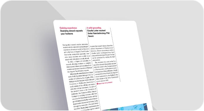 Gaining experience A solid grounding Studying abroad expands Claudia Lotter received your horizons Swiss Nanotechnology PhD Award During their master’s studies, numerous students on the nanoscience program gain As part of her master’s thesis at Basel Uni- experience abroad and apply for financial versity’s Department of Pharmaceutical aid in the form of Argovia Travel Grants. Sciences, former nanoscience student Due to the coronavirus pandemic, how- Claudia Lotter investigated how lipid ever, many students were unable to go nanoparticles developed for gene therapy ahead with their plans to study abroad. can be optimized by varying the lipid In 2022, a degree of normality re- composition. turned, allowing students to complete She completed this work in the first their master’s theses at international uni- year of her doctoral dissertation and pub- versities and receive financial aid through lished the results in the European Journal the Argovia Travel Grant program. of Pharmaceutics and Biopharmaceutics. Milan Liepelt wrote his master’s thesis In recognition of this publication, Claudia in the field of quantum biology at the Uni- was awarded a Swiss Nanotechnology PhD versity of California, Los Angeles (USA). Award sponsored by the Hightech Zen- Philippe van der Stappen went to Monash trum Aargau at the Swiss NanoConven- University in Melbourne (Australia) to tion in summer 2022. study regions of the cell that are respon- Report: http://bit.ly/3HSdh8V sible for cellular movement. As part of her master’s thesis at the University of California, San Francisco (USA), Tamara Utzinger is studying immune cells that can cross the blood-brain barrier and trig- ger inflammation in the event of neuro- degenerative diseases in the brain. Lastly, through his research at Harvard Univer- sity (USA), Nicolai Jung contributed to the development of vaccines against malaria parasites. Mobility nanoscience program: http://bit.ly/3Jss64m Report about Nicolai Jung: http://bit.ly/3luCiQ2 “I would recommend that all students do the same and spend some time abroad. It might involve some extra work at first, but it’s definitely worthwhile!” Nicolai Jung former nanoscience student and now research assistent at the Walter and Eliza Hall Institute of Medical Research in Melbourne At the Swiss NanoConvention 2022, Claudia Lotter (Australia) was presented with a Swiss Nanotechnology PhD Award by Marcus Morstein (Hightech Zentrum Aargau). (Image: T. Byrne) 14 SNI Annual Report 2022