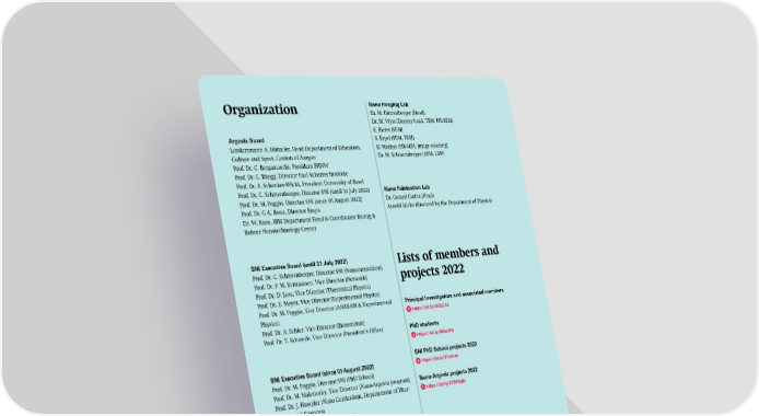 Nano Imaging Lab Organization Dr. M. Dürrenberger (Head) Dr. M. Wyss (Deputy head, TEM, FIB-SEM) E. Bieler (SEM) Argovia Board S. Erpel (SEM, TEM) Landammann A. Hürzeler, Head Department of Education, D. Mathys (FIB-SEM, image coloring) Culture and Sport, Canton of Aargau Dr. M. Schönenberger (AFM, LSM) Prof. Dr. C. Bergamaschi, President FHNW Prof. Dr. C. Rüegg, Director Paul Scherrer Institute Prof. Dr. A. Schenker-Wicki, President University of Basel Prof. Dr. C. Schönenberger, Director SNI (until 31 July 2022) Nano Fabrication Lab Prof. Dr. M. Poggio, Director SNI (since 01 August 2022) Dr. Gerard Gadea (Head) Prof. Dr. G.-L. Bona, Director Empa Arnold Lücke (financed by the Department of Physics) Dr. W. Riess, IBM Department Head & Coordinator Binnig & Rohrer Nanotechnology Center SNI Executive Board (until 31 July 2022) Lists of members and Prof. Dr. C. Schönenberger, Director SNI (Nanocurriculum) Prof. Dr. P. M. Kristiansen, Vice Director (Network) projects 2022 Prof. Dr. D. Loss, Vice Director (Theoretical Physics) Prof. Dr. E. Meyer, Vice Director (Experimental Physics) Prof. Dr. M. Poggio, Vice Director (ANAXAM & Experimental Principal Investigators and associated members Physics) https://bit.ly/3lGLCAk Prof. Dr. A. Schier, Vice Director (Biozentrum) Prof. Dr. T. Schwede, Vice Director (President’s Office) PhD students https://bit.ly/3EbvZHv SNI PhD School projects 2022 SNI Executive Board (since 01 August 2022) https://bit.ly/3YsHcvn Prof. Dr. M. Poggio, Director SNI (PhD School) Prof. Dr. M. Maletinsky, Vice Director (Nano-Argovia program) Nano-Argovia projects 2022 Prof. Dr. J. Huwyler (Nano Curriculum, Departement of Phar- https://bit.ly/3YWNqDs maceutcial Sciences) Prof. Dr. R. Y. H. Lim (Biozentrum) Prof. Dr. K. Moselund (Paul Scherrer Institute) Prof. Dr. T. Schwede (President’s Office) Prof. Dr. O. Tagit (University of Applied Sciences Northwestern Switzerland) Further information Prof. Dr. O. Wenger (Department of Chemistry) C. Wirth, SNI General Manager (HR, Finance, Administration) Prof. Dr. I. Zardo (Nano Technology Center, Department of Physics) If you would like to know more about the Swiss Nanoscience Institute, please visit our website (www.nanoscience.ch) or fol- low us on LinkedIn, Twitter or YouTube. There we regularly post news from the network. SNI Management C. Wirth, General Manager (HR, Finance, Administration) Scientific supplement Dr. A. Baumgartner (PhD School) Scientific reports from all the Nano-Argovia and SNI PhD School Dr. A. Car (Coordination Nano Curriculum) projects from 2022 can be found on our website or by scanning S. Chambers (Coordination Nano Curriculum) the QR code. Dr. K. Beyer-Hans (Communications, outreach) http://bit.ly/3Y5fVht S. Hüni (Communications, outreach) Dr. C. Möller (Communications, media contact, social media) Dr. M. Wegmann (Communications, outreach, social media) 56 SNI Annual Report 2022