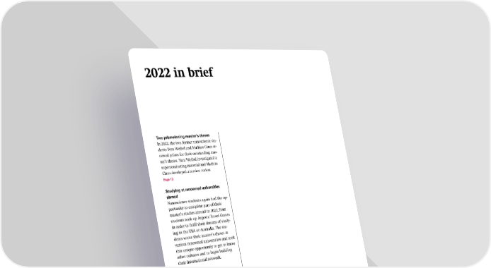 2022 in brief Two prizewinning master’s theses In 2022, the two former nanoscience stu- dents Vera Weibel and Mathias Claus re- ceived prizes for their outstanding mas- ter’s theses. Vera Weibel investigated a superconducting material and Mathias Claus developed a torsion rocker. Page 13 Studying at renowned universities abroad Nanoscience students again had the op- portunity to complete part of their master’s studies abroad in 2022. Four students took up Argovia Travel Grants in order to fulfil their dreams of study- ing in the USA or Australia. The stu- dents wrote their master’s theses at various renowned universities and took this unique opportunity to get to know other cultures and to begin building their international network. Page 14 Swiss Nanotechnology PhD Award for young researchers from the SNI network Former nanoscience student Claudia Lotter and former SNI doctoral student Dr. A short video Informal conference for doctoral students Thomas Mortelmans received the Swiss summarizes The year 2022 also saw the return of the “Nanoscience in the Nanotechnology PhD Award. In her mas- some key figures Snow” Winter School for doctoral students at the SNI. Sur- ter’s thesis, Claudia Lotter investigated and activities of rounded by breathtaking scenery in Zermatt, the young scien- how lipid nanoparticles developed for gene the SNI in 2022. tists used the time to exchange ideas about their wide-ranging therapy can be optimized by tweaking the research projects and to get to know each other better. lipid composition. In his doctoral disserta- Page 21 tion at the SNI PhD School, Thomas Mor- telmans built a new platform for antibody Varied topics tests. In 2022, seven doctoral students successfully completed their Pages 14 and 20 doctoral dissertations at the SNI PhD School, having carried out the corresponding practical work at the Department of Physics and the Biozentrum at the University of Basel and at the Paul Scherrer Institute. From page 17 4 SNI Annual Report 2022