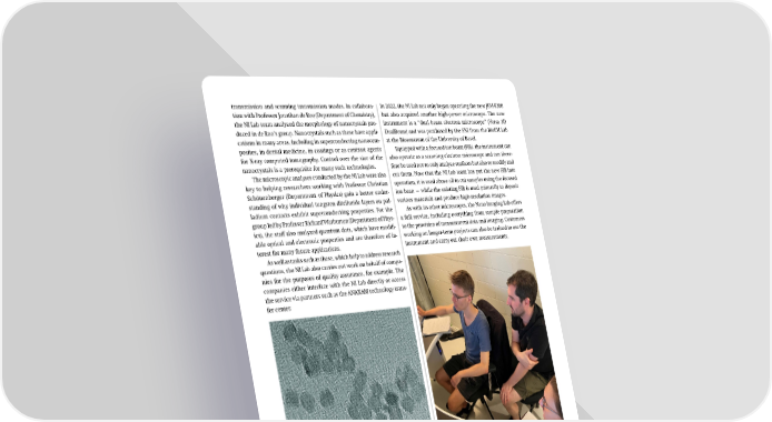 transmission and scanning transmission modes. In collabora- In 2022, the NI Lab not only began operating the new JEM-F200 tion with Professor Jonathan de Roo (Department of Chemistry), but also acquired another high-power microscope. The new the NI Lab team analyzed the morphology of nanocrystals pro- instrument is a “dual beam electron microscope” (Versa 3D duced in de Roo’s group. Nanocrystals such as these have appli- DualBeam) and was purchased by the SNI from the BioEM Lab cations in many areas, including in superconducting nanocom- at the Biozentrum of the University of Basel. posites, in dental medicine, in coatings or as contrast agents Equipped with a focused ion beam (FIB), the instrument can for X-ray computed tomography. Control over the size of the also operate as a scanning electron microscope and can there- nanocrystals is a prerequisite for many such technologies. fore be used not to only analyze surfaces but also to modify and The microscopic analyses conducted by the NI Lab were also cut them. Now that the NI Lab team has put the new FIB into key to helping researchers working with Professor Christian operation, it is used above all to cut samples using the focused Schönenberger (Department of Physics) gain a better under- ion bean — while the existing FIB is used primarily to deposit standing of why individual tungsten ditelluride layers on pal- various materials and produce high-resolution images. ladium contacts exhibit superconducting properties. For the As with its other microscopes, the Nano Imaging Lab offers group led by Professor Richard Warburton (Department of Phys- a full service, including everything from sample preparation ics), the staff also analyzed quantum dots, which have modifi- to the provision of measurement data and imaging. Customers able optical and electronic properties and are therefore of in- working on longer-term projects can also be trained to use the terest for many future applications. instrument and carry out their own measurements. As well as tasks such as these, which help to address research questions, the NI Lab also carries out work on behalf of compa- nies for the purposes of quality assurance, for example. The companies either interface with the NI Lab directly or access the service via partners such as the ANAXAM technology trans- fer center. Marcus Wyss (center) trains the first customers to use the new transmission electron microscope. With the help of the new scanning transmission electron microscope, the team from the NI Lab was able to visualize the structure of nanocrystals. (Image: Nano Imaging Lab, SNI, University of Basel) “The cross-sectional studies done by Marcus Wyss from the NI Lab with the brand new high-resolution STEM were a game-changer for us. We could now see what happens at electrical contacts to a topological material at the atomic scale.” Professor Christian Schönenberger, Department of Physics, University of Basel SNI Annual Report 2022 47