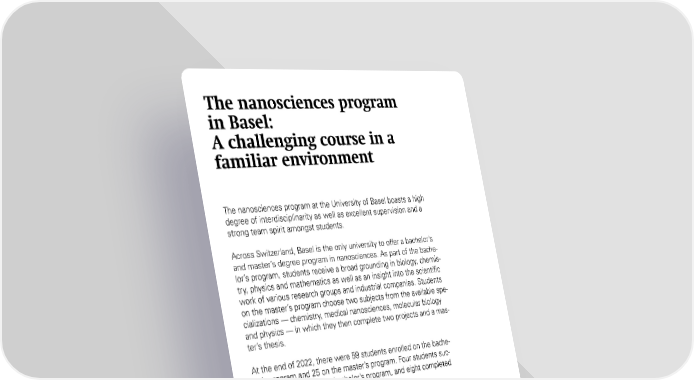 The nanosciences program in Basel: A challenging course in a familiar environment The nanosciences program at the University of Basel boasts a high degree of interdisciplinarity as well as excellent supervision and a strong team spirit amongst students. Across Switzerland, Basel is the only university to offer a bachelor’s and master’s degree program in nanosciences. As part of the bache- lor’s program, students receive a broad grounding in biology, chemis- try, physics and mathematics as well as an insight into the scientific work of various research groups and industrial companies. Students on the master’s program choose two subjects from the available spe- cializations — chemistry, medical nanosciences, molecular biology and physics — in which they then complete two projects and a mas- ter’s thesis. At the end of 2022, there were 59 students enrolled on the bache- lor’s program and 25 on the master’s program. Four students suc- cessfully completed the bachelor’s program, and eight completed their studies with a master’s degree. 12 SNI Annual Report 2022