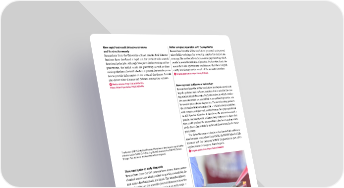 New rapid test could detect coronavirus Better sample preparation with the cryoWriter and flu simultaneously Researchers from the SNI network have presented an improved Researchers from the University of Basel and the Paul Scherrer microfluidic technique for preparing samples for electron mi- Institute have developed a rapid test for Covid-19 with a novel croscopy. The method allows them to avoid paper blotting, which functional principle. Although it requires further testing and im- results in a considerable loss of proteins. On the other hand, the provements, the initial results are promising: As well as deter- researchers also optimize the conditions so that there is signifi- mining whether a Covid-19 infection is present, the test also prom- cantly less damage to the sample at the air-water interface. ises to provide information on the status of the disease. It could Original publication: https://bit.ly/3HICnrQ also detect other diseases and different coronavirus variants. Media release: http://bit.ly/3YOrYRh Video: https://youtu.be/7VKskNZCoMc New approach in biosensor technology Researchers from the SNI network have developed a novel coat- ing of a polymer and carbon nanotubes that is suitable for coat- ing miniaturized electrodes. Such electrodes, in which conduc- tive nanomaterials are embedded in an antifouling matrix, can be used in point-of-care diagnostics. The novel coating protects the electrodes from contamination — which is always a problem with complex samples such as blood serum. In a paper published in ACS Applied Materials & Interfaces, the researchers used a protein associated with inflammatory responses to show that they could produce the assay within a few hours and quantita- tively detect the protein in undiluted blood serum in the nano- gram range. The Swiss Nanoscience Institute has funded this collabora- tion between researchers from CSEM, the FHNW School of Life The former SNI PhD student Thomas Mortelmans developed a rapid test for Sciences and the company MOMM Diagnostics as part of its infections with SARS-CoV-2 during his PhD thesis at the SNI PhD School. applied research program, Nano-Argovia. (Image: Paul Scherrer Institute/Mahir Dzambegovic) Original publication: https://bit.ly/3HkESPA Time-saving due to early diagnosis Researchers from the SNI network have shown that nanome- chanical sensors are ideally suited to quickly and reliably de- tect even a few bacteria in the blood. The interdisciplinary team describes in the scientific journal Biosensors how the method can be used to diagnose sepsis at an early stage — which allows more time for successful treatment. Original publication: http://bit.ly/3Rjk2VF A nanomechanical sensor can detect bacteria in a blood sample (Image: De- A novel coating for miniaturized electrodes in point-of-care diagnostics pre- partment of Physics, University of Basel) vents contamination — a problem when complex samples like blood serum are analyzed. (Image: CSEM Allschwil) SNI Annual Report 2022 25