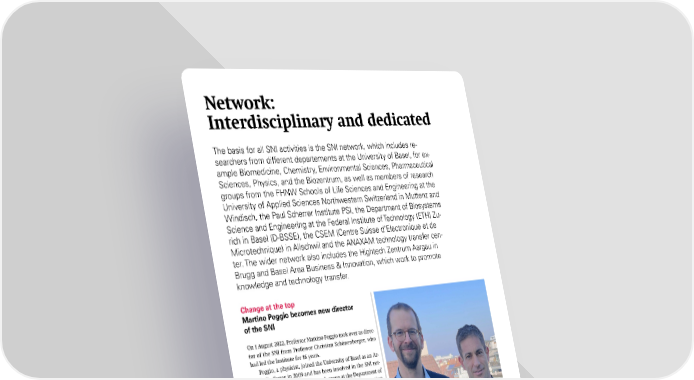 Network: Interdisciplinary and dedicated The basis for all SNI activities is the SNI network, which includes re- searchers from different departements at the University of Basel, for ex- ample Biomedicine, Chemistry, Environmental Sciences, Pharmaceutical Sciences, Physics, and the Biozentrum, as well as members of research groups from the FHNW Schools of Life Sciences and Engineering at the University of Applied Sciences Northwestern Switzerland in Muttenz and Windisch, the Paul Scherrer Institute PSI, the Department of Biosystems Science and Engineering at the Federal Institute of Technology (ETH) Zu- rich in Basel (D-BSSE), the CSEM (Centre Suisse d’Electronique et de Microtechnique) in Allschwil and the ANAXAM technology transfer cen- ter. The wider network also includes the Hightech Zentrum Aargau in Brugg and Basel Area Business & Innovation, which work to promote knowledge and technology transfer. Change at the top Martino Poggio becomes new director of the SNI On 1 August 2022, Professor Martino Poggio took over as direc- tor of the SNI from Professor Christian Schönenberger, who had led the Institute for 16 years. Poggio, a physicist, joined the University of Basel as an Ar- govia Professor in 2009 and has been involved in the SNI net- work since then. With his research group at the Department of Physics, he works on topics in nanomechanics, nanomagnetism and nanoimaging. As director of the SNI, Poggio will be sup- ported by Vice Director Professor Patrick Maletinsky and by the SNI Executive Committee as a strategic executive body. Various responsibilities were transferred to members of the Committee at the time of its renewal. The new members of the SNI Executive Committee represent partner institu- As Vice Director Patrick Maletinsky (left) supports Martino Poggio (right), tions and departments in the SNI network. Moreover, responsibility for the PhD who has been heading the Swiss Nanoscience Institute as Director since Au- program, the Nano-Argovia program and the service units of the Nano Technol- gust 2022. ogy Center is assumed by one member each of the Committee. 50 SNI Annual Report 2022