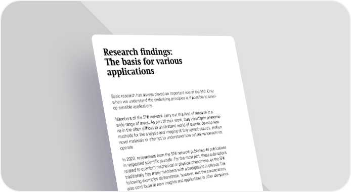 Research findings: The basis for various applications Basic research has always played an important role at the SNI. Only when we understand the underlying principles is it possible to devel- op sensible applications. Members of the SNI network carry out this kind of research in a wide range of areas. As part of their work, they investigate phenome- na in the often difficult to understand world of quanta, develop new methods for the analysis and imaging of tiny nanostructures, analyze novel materials or attempt to understand how natural nanomachines operate. In 2022, researchers from the SNI network published 44 publications in respected scientific journals. For the most part, these publications related to quantum mechanical or physical phenomena, as the SNI traditionally has many members with a background in physics. The following examples demonstrate, however, that the nanosciences also contribute to new insights and applications in other disciplines. 24 SNI Annual Report 2022