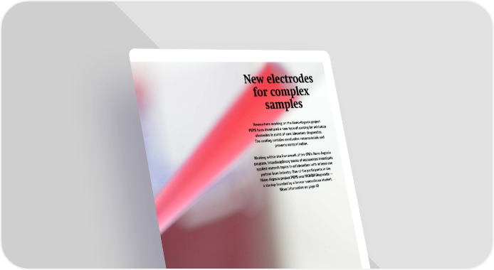 New electrodes for complex samples Researchers working on the Nano-Argovia project PEPS have developed a new type of coating for miniature electrodes in point-of-care laboratory diagnostics. The coating contains conductive nanomaterials and prevents contamination. Working within the framework of the SNI’s Nano-Argovia program, interdisciplinary teams of researchers investigate applied research topics in collaboration with at least one partner from industry. One of the participants in the Nano-Argovia project PEPS was MOMM Diagnostic — a startup founded by a former nanoscience student. More information on page 40 SNI Annual Report 2022 33