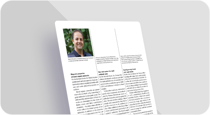 Mehdi Heydari conducted research for his doctor- During his doctorate, Thomas Mortelmans Alexina Ollier wrote her doctoral thesis at the De- al thesis at the Paul Scherrer Institute. worked at the Paul Scherrer Institute. He is now partment of Physics at the University of Basel. employed as a StepIn Trainee at the healthcare She is currently working there as a postdoc until organization Johnson & Johnson. she will start a postdoc position in South Korea at the Center for Quantum Nanoscience. Magnetic properties New test system for rapid Tracking energy losses of metal organic networks antibody tests with a pendulum For his doctoral thesis, Dr. Mehdi Heydari For his doctoral thesis, Dr. Thomas Mor- For her doctoral thesis, Dr. Alexina Ollier synthesized and subsequently character- telmans developed a novel test principle investigated energy losses and quantum ized various metal organic networks with for rapid antibody tests. He used the new effects in two-dimensional materials. To rare and exotic physical properties on system to detect antibodies against SARS- do this, she worked with a special atomic surfaces. CoV-2 and influenza A viruses in blood force microscope (AFM) whose cantilever Metal organic networks are porous samples. acts as a tiny pendulum that swings back sheets that are built up by connecting or- Unlike other rapid tests, which detect and forth and can indirectly measure en- ganic molecules via inorganic atoms. The specific virus components, the test devel- ergy losses during current flow. self-assembly and structure of these net- oped by Thomas Mortelmans reacts to Alexina studied single-layer graphene works are determined by the choice of antibodies formed by patients against the as well as molybdenum disulfide and linker atoms and their coordination virus. The test involves mixing a blood graphene bilayers, which have special chemistry — in conjunction with the re- sample with nanoparticles that bind to electrical properties when one layer is active ends or functional groups of the specific structures on the antibody sur- twisted at a magic angle relative to the molecules. In addition to the structure, face. Other additives in the form of fluo- other. She was able to show that the three the choice of components also has a de- rescent particles bind specifically to the different 2D materials differ greatly in cisive impact on the magnetic and elec- patients’ antibodies. The blood sample terms of energy loss and their quantum trical properties. prepared in this way is then dripped onto mechanical effects. After synthesizing several of these a Plexiglas chip into which nanochannels The free-floating single-layer graphene metal organic networks, Mehdi Heydari have been etched in a sophisticated pat- behaved similarly to quantum dots. In the showed that the magnetism typically ob- tern. During their passage through the twisted graphene bilayer, Alexina ob- served in such networks is annihilated in nanochannels, which takes place without served oscillations in the energy losses as those with triangular connectivity in a technical aids, the antibody-nanoparticle a function of the external magnetic field phenomenon referred to as “frustration” aggregates become trapped at particu- — probably as a result of quantum me- of a physical system. Frustrated metal or- larly narrow sites that correspond to the chanical interference effects. In an atomic ganic networks serve as interesting mod- size of the nanoparticles. Thanks to the layer of molybdenum disulfide, she de- els for the complex behavior of systems fluorescent appendages, this can be ob- tected a phase transition between ferro- exhibiting statistical fluctuation, such as served under the microscope. magnetism and paramagnetism. spin glasses. Coordination chemistry of- The system can be adapted to antibod- Video: https://youtu.be/gzlXDVMMDd0 fers a unique opportunity to design novel ies against all kinds of viruses and pro- Report in SNI INSight: http://bit.ly/3lv3Tk7 low-dimensional materials with a view to vides not only sensitive detection of an technological developments in spintron- infection, but also information about the ics and quantum information technology. immune system’s response based on dif- ferent signal strengths. Publication: https://bit.ly/40hHmH9 Video: https://youtu.be/7VKskNZCoMc SNI Annual Report 2022 17