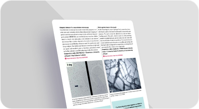 Adapted detector for cryo-electron microscopy Patch against ulcers in the mouth Cryo-electron microscopy has made tremendous progress in re- In the Nano-Argovia project Hydrogel Patch, researchers have cent years and nowadays allows three-dimensional imaging of developed a patch to be used for non-specific ulcers in the oral proteins in their natural environment in the cell. In the Nano-Ar- mucosa. The patch covers the affected areas and can deliver govia project HPDET-EM, an interdisciplinary team has collabo- healing agents. The patch, which is made of a self-assembling rated to install, test and apply a new detector in an electron synthetic peptide hydrogel, adheres well to the soft, moist oral microscope that is better adapted to the needs of cryo-electron mucosa and is free of animal ingredients. The researchers tested microscopy (cryo-EM) than detectors used for synchrotron and various methods and substances to cross-link and stabilize the X-ray analysis. The hybrid pixel detector tested has a high read- hydrogel and investigated biocompatibility and integration of out speed and sensitivity and is, therefore, particularly suited nanocapsules that release active ingredients. to further advance cryo-EM technology in the life sciences. Cooperation with: vVardis AG // FHNW School of Life Sci- Cooperation with: DECTRIS AG // Biozentrum, University ences // University Center for Dentistry at the University of Basel // Paul Scherrer Institute of Basel Project description: http://bit.ly/3K7PGDM Project description: http://bit.ly/3RYWBB5 In the Nano-Argovia project HPDET-EM, researchers are applying a new de- Electron micrograph of the peptide used in the Nano-Argovia project Hydro- tector adapted to the needs of cryo-electron microscopy. The image shows gel Patch. (Image: L. Kind, FHNW) E. coli bacteria as well as a bacteriophage (marked with the arrow) and gold particles. (Image: M. Er-Rafik, Biozentrum, University of Basel) “The Nano-Argovia project supports our efforts to “We are confident that this collaboration will help develop innovative and intelligent regeneration us to play a critical role in the important new market systems for oral applications.“ segment of cryo-electron microscopy.” Michael Hug, Co-CSO at vVardis AG Dr. Sacha de Carlo, Global Sales Manager EM at Dectris AG SNI Annual Report 2022 39