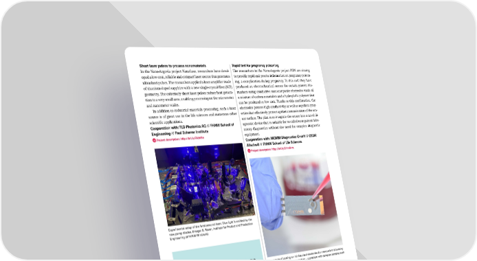 Short laser pulses to process nanomaterials Rapid test for pregnancy poisoning In the Nano-Argovia project NanoLase, researchers have devel- The researchers in the Nano-Argovia project PEPS are aiming oped a low-cost, reliable and compact laser source that generates to provide rapid and precise information on pregnancy poison- ultrashort pulses. The researchers applied a laser amplifier made ing, a complication during pregnancy. To this end, they have of titanium-doped sapphire with a new single-crystal fiber (SCF) produced an electrochemical sensor for certain protein bio- geometry. The extremely short laser pulses reduce heat genera- markers using conductive nanocomposite electrodes made of tion to a very small area, enabling processing on the micrometer a mixture of carbon nanotubes and a hydrophilic polymer that and nanometer scales. can be produced at low cost. Thanks to this combination, the In addition to industrial materials processing, such a laser electrodes possess high conductivity as well as repellent prop- source is of great use in the life sciences and numerous other erties that effectively protect against contamination of the sen- scientific applications. sor surface. The plan is to integrate the sensor into a novel di- Cooperation with: TLD Photonics AG // FHNW School of agnostic device that is suitable for so-called near-patient labo- Engineering // Paul Scherrer Institute ratory diagnostics without the need for complex diagnostic Project description: http://bit.ly/3lzbtKe equipment. Cooperation with: MOMM Diagnostics GmbH // CSEM Allschwil // FHNW School of Life Sciences Project description: http://bit.ly/3Yve6vm Experimental setup of the femtosecond laser. Blue light is emitted by the new pump diodes. (Image: B. Resan, Institute for Product and Production Engineering at FHNW Windisch) “The NanoLase project is very promising for TLD A new type of coating on miniaturized electrodes for near-patient laboratory Photonics as it can bring about a new product line diagnostics prevents contamination – a problem with complex samples such for TLD Photonics, making a breakthrough from as blood serum. (Image: CSEM Allschwil) laser micro to laser nanomachining.” Stephan von Wolff, CEO of TLD Photonics AG “The Nano-Argovia Project PEPS has enabled us to investigate whether our nanocomposite electrodes are suitable for use in highly sensitive electrochemical POC assays.” Dr. Mathias Wipf, Founder and CEO of MOMM Diagnostics with a master in nanosciences from the University of Basel 40 SNI Annual Report 2022