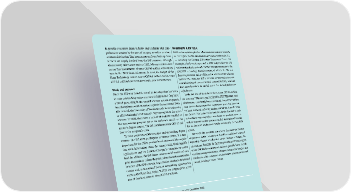 to provide customers from industry and academia with com- Investments in the future prehensive services in the area of imaging as well as in micro With a view to driving further advances in nanoscience research and nano fabrication. The investments needed to build up these in the region, the SNI also invested in various projects in 2022 services are largely funded from the SNI’s reserves. Although — including the Electron Diffraction Experience Center, for the necessary orders were made in 2022, delivery problems have example, which was inaugurated in 2022 and provides the SNI meant that investments of some CHF 0.9 million will only ap- with services for its network. Further investments relate to the pear in the 2023 financial report. In total, the budget of the ANAXAM technology transfer center, of which the SNI is a Nano Technology Center ran to CHF 0.8 million. So far, some founding member, and a collaboration with the Paul Scherrer CHF 0.5 million have been invested in new infrastructure. Institute PSI. Here, the SNI is involved in the realization and commissioning of an experimental station (SOPHIE), which al- Study and outreach lows experiments to be carried out at the Swiss Synchrotron Since the SNI was founded, one of its key objectives has been Light Source. to train outstanding early career researchers so that they have In the last line of the balance sheet, some CHF 6.6 million a broad grounding in the natural sciences and can engage in are shown as “SNI assets per 31/12/2022 in CHF.” However, most interdisciplinary work on various topics in the nanoworld. With of this money has already been committed. Some CHF 1 million this in mind, the University of Basel is the only Swiss university have already been committed in previous years, but have not to offer a bachelor’s and master’s degree program in the nano- yet been invoiced, including equipment for the Nano Technol- sciences. In 2022, there were a total of 84 students enrolled on ogy Center. This balance also includes funds allocated to indi- the nanoscience program (59 on the bachelor’s and 25 on the vidual Nano-Argovia projects that have not yet been spent, as master’s degree course). The SNI contributed some CHF 0.5 mil- well as reserves used to guarantee a full 48-months of funding lion to the program’s costs. for all doctoral students currently enrolled in the SNI PhD To raise awareness of these unique and demanding degree school. courses, the SNI team participates in various events. It is also We would like to extend our sincere thanks to the Finance important for the SNI to provide broad sections of the popula- department at the University of Basel for its efficient financial tion with information about the nanosciences, their possible reporting. Thanks are also due to the Cantons of Aargau, Ba- applications and the Canton of Aargau’s commitment to this sel-Stadt and Baselland for their long-standing and loyal support field. In addition, the SNI shares news on social media and uses of the SNI. Their commitment makes it possible for us to train print materials to inform the public about its various activities. excellent young researchers, obtain new scientific insights and In terms of the SNI network, key activities also include internal collaborate with companies on innovative projects as we work events such as the Annual Event or networking opportunities toward building a better future. such as the Nano-Tech Apéro. In 2022, the outgoings for activi- ties of this kind came to about CHF 0.2 million. The following table shows the SNI balance sheet as of 31 December 2022: SNI balance sheet 2022 in CHF Univ. Basel Canton AG Total Grants Investment income 2,660,800 5,000,000 7,660,800 ( 7,139) 7,736 597 Income 2,653,661 5,007,736 7,661,397 Expenditure 2,942,292 5,139,523 8,081,815 Balance year 2022 (288,631) (131,787) (420,418) SNI assets per 01/01/2022 1,992,975 5,055,548 7,048,523 Annual balance (288,631) (131,787) (420,418) SNI assets per 31/12/2022 in CHF 1,704,344 4,923,761 6,628,105 SNI Annual Report 2022 55