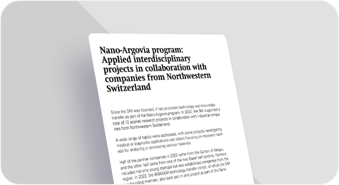 Nano-Argovia program: Applied interdisciplinary projects in collaboration with companies from Northwestern Switzerland Since the SNI was founded, it has promoted technology and knowledge transfer as part of the Nano-Argovia program. In 2022, the SNI supported a total of 12 applied research projects in collaboration with industrial compa- nies from Northwestern Switzerland. A wide range of topics were addressed, with some projects investigating medical or diagnostic applications and others focusing on improved meth- ods for analyzing or processing various materials. Half of the partner companies in 2022 came from the Canton of Aargau, and the other half came from one of the two Basel half cantons. Partners included not only young startups but also established companies from the region. In 2022, the ANAXAM technology transfer center, of which the SNI is a founding member, also took part in one project as part of the Nano- Argovia program. 34 SNI Annual Report 2022