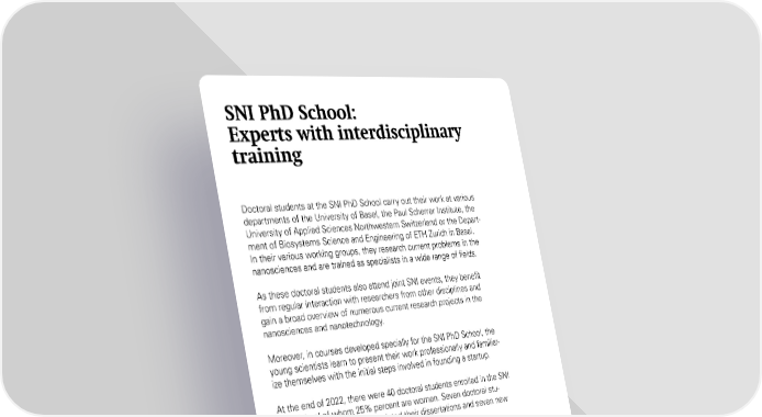 SNI PhD School: Experts with interdisciplinary training Doctoral students at the SNI PhD School carry out their work at various departments of the University of Basel, the Paul Scherrer Institute, the University of Applied Sciences Northwestern Switzerland or the Depart- ment of Biosystems Science and Engineering of ETH Zurich in Basel. In their various working groups, they research current problems in the nanosciences and are trained as specialists in a wide range of fields. As these doctoral students also attend joint SNI events, they benefit from regular interaction with researchers from other disciplines and gain a broad overview of numerous current research projects in the nanosciences and nanotechnology. Moreover, in courses developed specially for the SNI PhD School, the young scientists learn to present their work professionally and familiar- ize themselves with the initial steps involved in founding a startup. At the end of 2022, there were 40 doctoral students enrolled in the SNI PhD School of whom 25% percent are women. Seven doctoral stu- dents have successfully completed their dissertations and seven new dissertation projects are set to begin in 2023. Of the 48 SNI doctoral students who have completed their dissertations so far, 69% are employed in industry, while 31% continue to pursue an academic career. 16 SNI Annual Report 2022
