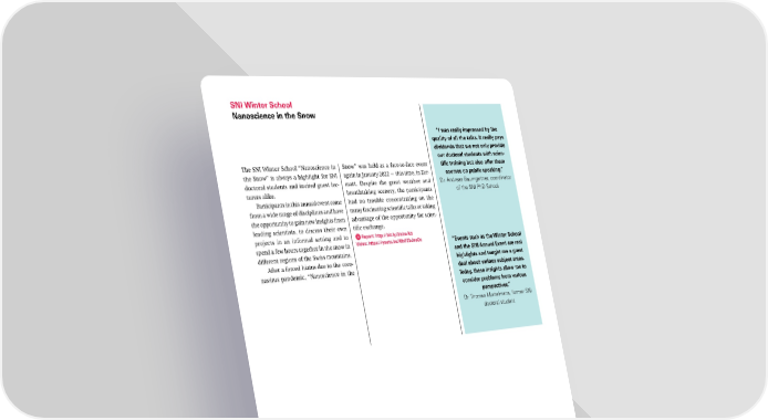 SNI Winter School Nanoscience in the Snow “I was really impressed by the quality of all the talks. It really pays dividends that we not only provide our doctoral students with scien- The SNI Winter School “Nanoscience in Snow” was held as a face-to-face event tific training but also offer them the Snow” is always a highlight for SNI again in January 2022 — this time, in Zer- courses on public speaking.” doctoral students and invited guest lec- matt. Despite the great weather and Dr. Andreas Baumgartner, coordinator turers alike. breathtaking scenery, the participants of the SNI PhD School Participants in this annual event come had no trouble concentrating on the from a wide range of disciplines and have many fascinating scientific talks or taking the opportunity to gain new insights from advantage of the opportunity for scien- leading scientists, to discuss their own tific exchange. projects in an informal setting and to Report: http://bit.ly/3lxbwXd spend a few hours together in the snow in Video: https://youtu.be/KfnFZbJneOc “Events such as the Winter School different regions of the Swiss mountains. and the SNI Annual Event are real After a forced hiatus due to the coro- highlights and taught me a great navirus pandemic, “Nanoscience in the deal about various subject areas. Today, these insights allow me to consider problems from various perspectives.” Dr. Thomas Mortelmans, former SNI doctoral student At the SNI Winter School, doctoral students from the SNI and researchers from various disciplines engage in intensive scien- tific exchange. In 2022, “Nanoscience in the Snow” was held in Zermatt. SNI Annual Report 2022 21