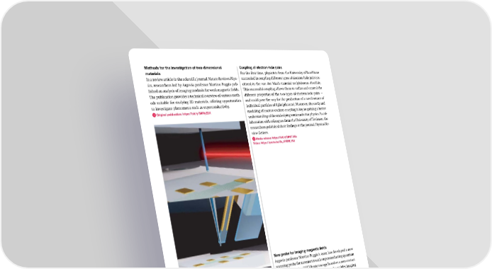 Methods for the investigation of two-dimensional Coupling of electron-hole pairs materials For the first time, physicists from the University of Basel have In a review article in the scientific journal Nature Reviews Phys- succeeded in coupling different types of electron-hole pairs (ex- ics, researchers led by Argovia professor Martino Poggio pub- citons) in the van der Waals material molybdenum disulfide. lished an analysis of imaging methods for weak magnetic fields. This successful coupling allows them to utilize and control the The publication provides a technical overview of various meth- different properties of the two types of electron-hole pairs — ods suitable for studying 2D materials, offering opportunities and could pave the way for the production of a novel source of to investigate phenomena such as superconductivity. individual particles of light (photons). Moreover, the study and Original publication: https://bit.ly/3HMy2DX modeling of exciton-exciton coupling is key to gaining a better understanding of the underlying semiconductor physics. In col- laboration with colleagues from the University of Toulouse, the researchers published their findings in the journal Physical Re- view Letters. Media release: https://bit.ly/3HWTd5b Video: https://youtu.be/Sq_KVBM_WzI New probe for imaging magnetic fields Argovia professor Martino Poggio’s team has developed a new scanning probe for nanometer-scale superconducting quantum interference device (SQUID) microscopy based on a non-contact atomic force microscopy cantilever. The probe enables imaging of magnetic fields with nanometer spatial resolution. The pub- lication in the scientific journal Physical Review Applied is a contribution to a FET Open project led by the Poggio team. Original publication: https://bit.ly/3YwAZyj Researchers from the SNI network have compared different imaging meth- ods for weak magnetic fields that enable nanometer-scale resolution. (Imag- es: Department of Physics, University of Basel) The new probe enables high-resolution imaging of weak magnetic fields. (Image: Department of Physics, University of Basel) 30 SNI Annual Report 2022