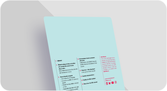 3 Editorial 4 Biotechnology in the production of a protein for autoimmune diagnostics Katja Ammann receives the prize for the best master’s thesis 6 Nano-Argovia program – New lenses for 3D imaging – Low-noise amplifier for quantum signals – Wound healing without stitches or clips – Degradable implants with opti- mized mechanical properties – Tracking down water pollution 18 Guest article by Selina Eng Self-healing hydrogel Master`s thesis in Maastricht 20 3D structures thanks to electron diffraction Collaboration with ELDICO Scientific enables structural elucidation of tiny crystals 22 YQuantum – Why Quantum? A new partner in the network 25 Awards and promotions 26 Funding for SNI members 28 News from the SNI network www.nanoscience.ch Follow us on: SNI INSight Twice a year, SNI INSight informs you about the Swiss Nanoscience Institute’s activities and results in research, education, technology, knowledge transfer and public relations. Previous issues are available on our website under SNI INSight. 2 SNI INSight June 2025