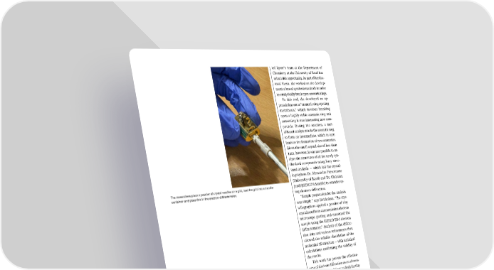 tof Sparr’s team at the Department of Chemistry at the University of Basel has seized this opportunity. As part of her doc- toral thesis, she worked on the develop- ment of novel synthesis methods in order to catalytically break open aromatic rings. To this end, she developed an ap- proach known as “aromatic ring-opening metathesis,” which involves breaking open a highly stable aromatic ring and converting it into interesting new com- pounds. During the reaction, a met- al-based catalyst attacks the aromatic ring to form an intermediate, which in turn leads to the formation of new aromatics. Given the small crystal size of less than 1 μm, however, it was not possible to an- alyze the structures of all the newly syn- thesized compounds using X-ray struc- tural analysis — which led the crystal- lographers Dr. Alessandro Prescimone (University of Basel) and Dr. Christian Jandl (ELDICO Scientific) to consider us- ing electron diffraction. “Sample preparation for the analysis was simple,” says Hutskalova. “The crys- tallographers applied a powder of tiny crystal needles to a transmission electron microscope grating and measured the sample using the ELDICO ED-1 electron diffractometer.” Analysis of the diffrac- tion data and various refinements then allowed the reliable elucidation of the molecules’ 3D structure — with statistical calculations confirming the validity of the results. This work has proven the effective- ness of electron diffraction as an alterna- tive to single crystal X-ray analysis for tiny crystals when it comes to elucidating the 3D structure of a new group of substances. “We assume that electron diffraction will undergo further development and play an increasingly central role in structural analysis in organic chemistry in the fu- ture,” Sparr concludes. Further information: Research group C. Sparr, University of Basel ELDICO Scientific Publication in Nature 638 (2025) Publication in Chimia 79 (2025) The researchers place a powder of crystal needles on a grid, load the grid into a transfer container and place this in the electron diffractometer. Christian Jandl (ELDICO Scientific) selects the correct crystal, centers the device and carries out the measurements. The grid with the sample is rotated step by step so that the electron beam hits the crystal from different angles. The computer then calculates the three-dimen- sional structure of the analyzed compound from the various diffraction images. 21 SNI INSight June 2025