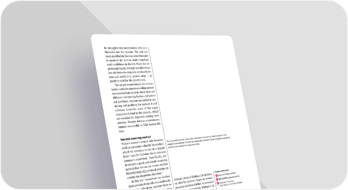 be smuggled into mammalian cells as a blueprint for the protein. The cell cul- tures modified in this way were then able to produce the protein under standard- ized conditions in the lab. From the su- pernatant liquid, Amman was able to iso- late the biotechnologically produced pro- tein and purify it in several steps — as purity is vital for the specific test. This might sound simple, but it is ac- tually a complex process entailing numer- ous intermediate steps in which there are different influencing factors and poten- tial problems. Amman succeeded in pro- ducing and purifying the protein in cell cultures; however, some of the sugar structures bound to the protein, which are essential for diagnostic testing, were missing. Despite further experiments, Amman was unable to fully resolve this issue. Valuable screening method “Katja’s master’s project did, however, yield an extremely valuable ‘by-product,’ which we continue to use on a regular basis,” says Dr. Christina Bauer, who was Amman’s supervisor. “Specifically, she developed a quick and simple screening method that we can use to test whether biotechnologically produced proteins are suitable for diagnostic detection.” In this test, researchers can produce their proteins from cells on a small scale, break the cells down, separate them us- ing gel electrophoresis, and then incu- bate them directly with patient serums in order to investigate their binding to the protein. “This rapid screening tech- nique, which is based on the western blot method, saves us a great deal of work be- cause we don’t need large amounts of the protein for detection — and there’s also no need to purify it,” explains Bauer. The right choice For Ammann, the aim of completing her master’s thesis in industry was an excel- lent choice: “I received first-rate supervi- sion, both from the team at BÜHLMANN Laboratories AG and from Professor Daniel Ricklin from the Department of Pharma- ceutical Sciences at the University of Ba- sel,” she says. “Above all, the project taught me that a lot of research is about looking for reasons why something didn’t go to plan. Even if something doesn’t work out, the insights obtained are still valuable,” she says, summarizing her experience. Amman’s hope of finding a job in indus- try after her master’s degree in nanosci- ences has also been fulfilled. As a research associate at LimmaTech Biologics AG (Schlieren), she is still working in protein engineering — albeit with a view to iden- tifying vaccines against antibiotic-resis- tant bacteria. She therefore continues to pursue her ambition of working on applied research, contributing ideas of her own, enjoying herself, and having a positive impact on humanity all at the same time. We would like to wish her all the best for the future and congratulate her on her excellent master’s thesis! As a by-product of her work, Katja developed a screening method based on the western blot method. This can be used to test whether biotechnologically produced proteins are suitable for diagnostic tests. “Having Katja in the lab was a real asset for us.” Dr. Christina Bauer, senior scientist, BÜHLMANN Laboratories AG Further information: Video with Katja Ammann BÜHLMANN Laboratories AG Molecular Pharmacy Prof. Ricklin, University of Basel 5 SNI INSight June 2025