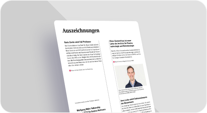 Auszeichnungen Ilaria Zardo wird Full Professor Der Universitätsrat hat Prof. Dr. Ilaria Zardo rückwir- kend zum 1. Februar 2025 zum Full Professor befördert. Ilaria Zardo ist seit 2015 als Professorin für Experimen- tal Material Physics am Departement Physik der Univer- sität Basel tätig. Sie leitet zudem das Nano Technology Center des SNI und ist Mitglied des SNI-Exekutivkomi- tees. Ihr Forschungsgebiet konzentriert sich auf die Un- tersuchung von Phononen, wie sie auch in einem Video über ihre Arbeit erklärt. Video mit Ilaria Zardo über ihre Forschung Ilaria Zardo wurde zum Full Professor befördert. Wolfgang Mehr Fellowship Award 2024 für Andrea Hofmann Im Februar 2025 erhielt Prof. Dr. Andrea Hofmann den Wolfgang Mehr Fellowship Award, der jährlich vom Leibniz-Institut für innovative Mikroelektronik (Frank- furt a.d. Oder, Deutschland) verliehen wird. Sie bekam diese Auszeichnung für ihre herausragenden Beiträge auf dem Gebiet der Halbleiterphysik. Mitteilung Leibniz-Institut für innovative Mikroelektronik Video mit Andrea Hofmann über ihre Forschung Andrea Hofmann wurde mit dem Wolfgang Mehr Fellowship Award ausgezeichnet. Oliver Germershaus ist neuer Leiter des Instituts für Pharma- technologie und Biotechnologie Prof. Dr. Oliver Germershaus hat im April 2025 die Lei- tung des Instituts für Pharmatechnologie und Biotech- nologie (Hochschule für Life Sciences FHNW) von Prof. Dr. Georgios Imanidis übernommen. News University of Applied Sciences FHNW Oliver Germershaus leitet seit April 2025 das Institut für Pharmatechnologie und Biotechnologie an der Hochschule für Life Sciences FHNW. (Bild: FHNW) Anna Leder erhält Doktorandenpreis des Biozentrums Die ehemalige Nano-Studentin Anna Leder, die zurzeit bei Prof. Dr. Sebastian Hiller (Biozentrum) ihre Doktor- arbeit schreibt, wurde im Rahmen des Biozentrum Sym- posiums 2025 mit dem J.C.W. Shepherd Doktoranden- Preis für ihre exzellente wissenschaftliche Leistung aus- gezeichnet. Geehrt wurde sie für die Entdeckung, dass das Endoplasmatische Retikulum in dynamische «Fal- tungsfabriken» unterteilt ist, die eine effiziente und ef- fektive Proteinfaltung ermöglichen. SNI-Post Die ehemalige Nanostudentin Anna Leder erhielt den Doktorandenpreis des Biozentrums. 25 SNI INSight Juni 2025