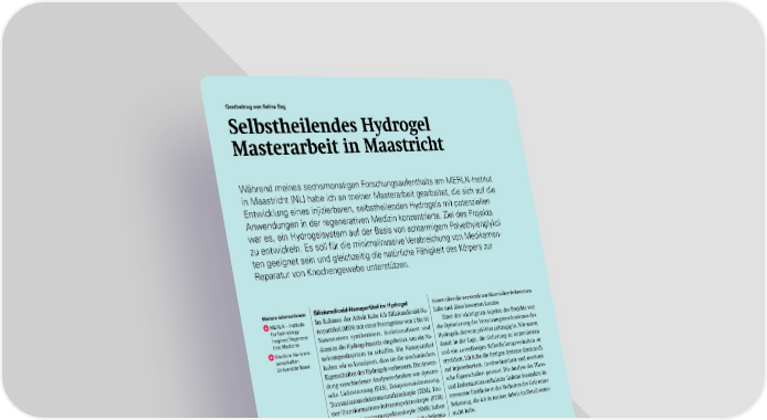 Siliziumdioxid-Nanopartikel im Hydrogel Im Rahmen der Arbeit habe ich Siliziumdioxid-Na- nopartikel (MSN) mit einer Porengrösse von 2 bis 50 Nanometern synthetisiert, funktionalisiert und dann in die Hydrogelmatrix eingebettet, um ein Na- nokompositsystem zu schaffen. Die Nanopartikel haben wir so konzipiert, dass sie die mechanischen Eigenschaften des Hydrogels verbessern. Die Anwen- dung verschiedener Analysetechniken wie dynami- sche Lichtstreuung (DLS), Zetapotenzialmessung, Transmissionselektronenmikroskopie (TEM), Fou- rier-Transformations-Infrarotspektroskopie (FTIR) und Kernspinresonanzspektroskopie (NMR) haben dann dafür gesorgt, dass ich umfangreiche Informa- tionen über die verwendeten Materialien bekommen habe und diese bewerten konnte. Einer der wichtigsten Aspekte des Projekts war die Optimierung des Vernetzungsmechanismus des Hydrogels, der vom pH-Wert abhängig ist. Wir waren damit in der Lage, die Gelierung zu kontrollieren und ein zuverlässiges Selbstheilungsverhalten zu erreichen. Ich habe die fertigen Systeme dann noch auf Injizierbarkeit, in-vitro-Stabilität und mechani- sche Eigenschaften getestet. Die Analyse des Fliess- und Deformationsverhaltens lieferte besonders in- teressante Einblicke in das Verhalten der Gele unter Belastung, die ich in meiner Arbeit im Detail unter- sucht habe. Weitere Informationen: MERLN – Institute for Technology- Inspired Regenera- tive Medicine Studium Nanowis- senschaften Universität Basel Selbstheilendes Hydrogel Masterarbeit in Maastricht Während meines sechsmonatigen Forschungsaufenthalts am MERLN-Institut in Maastricht (NL) habe ich an meiner Masterarbeit gearbeitet, die sich auf die Entwicklung eines injizierbaren, selbstheilenden Hydrogels mit potenziellen Anwendungen in der regenerativen Medizin konzentrierte. Ziel des Projekts war es, ein Hydrogelsystem auf der Basis von achtarmigem Polyethylenglykol zu entwickeln. Es soll für die minimalinvasive Verabreichung von Medikamen- ten geeignet sein und gleichzeitig die natürliche Fähigkeit des Körpers zur Reparatur von Knochengewebe unterstützen. Selina Eng hat für ihre Masterarbeit am MERLN-Institut in Maastricht (NL) gearbeitet. Mit dem Velo lässt sich Maastricht besonders gut entdecken. Gastbeitrag von Selina Eng 16 SNI INSight Juni 2025