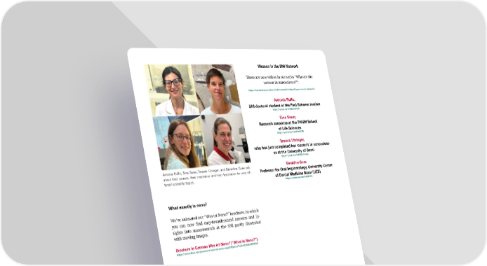 Women in the SNI Network There are new videos in our series “Who are the women in nanoscience?”: https://nanoscience.unibas.ch/de/outreach/videos/frauen-im-sni-netzwerk/ Antonia Ruffo, SNI doctoral student at the Paul Scherrer Institut https://youtu.be/V386tx4PLFA Sina Saxer, Research associate at the FHNW School of Life Sciences https://youtu.be/YzNFfA4CiF8 Tamara Utzinger, who has just completed her master’s in nanoscienc- es at the University of Basel https://youtu.be/5t6SMUYxaj4 Antonia Ruffo, Sina Saxer, Tamara Utzinger, and Géraldine Guex talk Géraldine Guex about their careers, their motivation and their fascination for very dif- Professor for Oral Implantology, University Center ferent scienti昀椀c topics. of Dental Medicine Basel (UZB) https://youtu.be/4nbXd3jKkZ0 What exactly is nano? We’ve animated our “Was ist Nano?” brochure, in which you can now 昀椀nd easy-to-understand answers and in- sights into nanoresearch at the SNI partly illustrated with moving images. Brochure in German Was ist Nano? (“What is Nano?”): https://sniunibas.relayto.com/e/was-ist-nano-rppx3iftjvkzn?hub=651d6a40795e2 Annual Event 2023 From September 6—8, the members of the SNI network met for the Annual Event — which was held, for the 昀椀rst time, in the Canton of Aargau, speci昀椀cally at Lake Hallwil. It was a great conference, with exciting talks and post- ers on basic and applied research in wide-ranging areas of the nanosciences, as well as opportunities to network and exchange ideas. Video: For the 昀椀rst time, members of the SNI network met at Lake Hallwil for https://youtu.be/f4HHrbnXw88 their Annual Event. SNI INSight — Showcasing research and activities of the Swiss Nanoscience Institute Concept, text and layout: C. Möller, M. Poggio Translations and proof-reading: UNIWORKS (Erlangen, Germany) Image credits: C. Möller and named sources © Swiss Nanoscience Institute, December 2023 SNI INSight December 2023 28