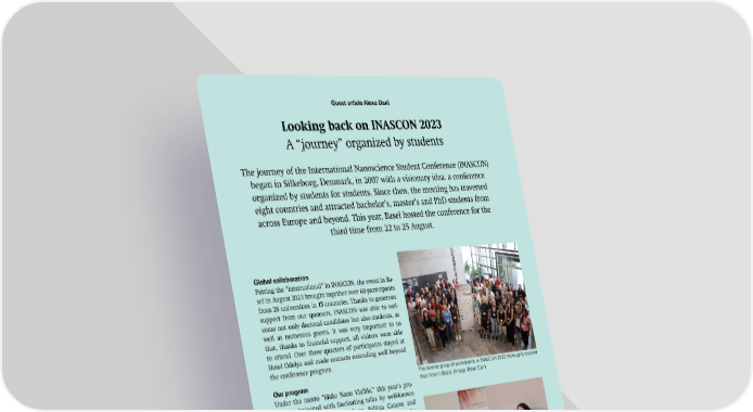 Guest article Alexa Dani Looking back on INASCON 2023 A “journey” organized by students The journey of the International Nanoscience Student Conference (INASCON) began in Silkeborg, Denmark, in 2007 with a visionary idea: a conference organized by students for students. Since then, the meeting has traversed eight countries and attracted bachelor’s, master’s and PhD students from across Europe and beyond. This year, Basel hosted the conference for the third time from 22 to 25 August. Global collaboration Putting the “international” in INASCON, the event in Ba- sel in August 2023 brought together over 60 participants from 26 universities in 15 countries. Thanks to generous support from our sponsors, INASCON was able to wel- come not only doctoral candidates but also students, as well as numerous guests. It was very important to us that, thanks to 昀椀nancial support, all visitors were able to attend. Over three quarters of participants stayed at Hotel Odelya and made contacts extending well beyond the conference program. Our program The diverse group of participants in INASCON 2023 thoroughly enjoyed their time in Basel. (Image: Peter Dani) Under the motto “Make Nano Visible,” this year’s pro- gram culminated with fascinating talks by well-known scientists: Anne Géraldine Guex, Sabina Caneva and Patrick Shahgaldian shared their specialist knowledge and highlighted the importance of interdisciplinary ap- proaches in the biosciences. James Wootton from IBM Research Europe – Zurich brought a spot of humor to the conference with his talk on quantum error correction. In another highlight of INASCON, Clarice Aiello gave a pub- lic talk on quantum biology, captivating over 170 science enthusiasts and triggering the longest Q&A session of the conference. We were also privileged to welcome two Nobel laureates among our guests: Kurt Wüthrich, who Professor Morten Meldal at his Professor Clarice Aiello at her provided some insights into 60 years of research in the talk “Molecular Click Adventures public talk on the subject of quan- 昀椀eld of protein NMR, and Morten Meldal, who explained — A Leap from the Shoulders of tum biology. She explained how his groundbreaking work in the area of click chemistry Giants.” (Image: Tania Beringer) nature uses quantum processes and o昀昀ered us an insight into the Nobel Prize award cer- to achieve optimum operation emony. and how we can control these processes for therapeutic bene昀椀t. (Image: Tania Beringer) “Last week, I had the great pleasure of speaking before brilliant young minds at INASCON in Basel.” Professor Morten Meldal SNI INSight December 2023 20
