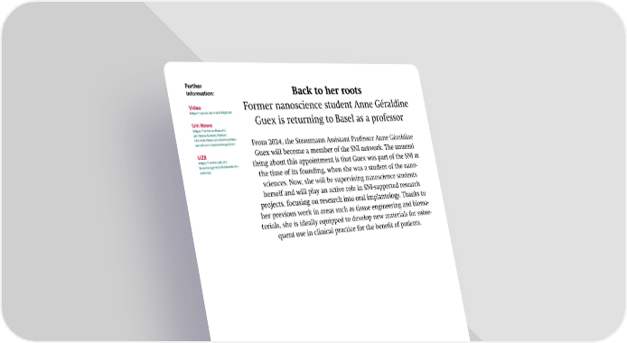Further Back to her roots information: Video Former nanoscience student Anne Géraldine https://youtu.be/4nbXd3jKkZ0 Uni News Guex is returning to Basel as a professor https://www.unibas.ch/ en/News-Events/News/ Uni-Info/New-assistant-profes- sor-of-oral-implantology.html From 2024, the Straumann Assistant Professor Anne Géraldine UZB Guex will become a member of the SNI network. The unusual https://www.uzb.ch/ thing about this appointment is that Guex was part of the SNI at forschung/mitarbeitende-for- schung/ the time of its founding, when she was a student of the nano- sciences. Now, she will be supervising nanoscience students herself and will play an active role in SNI-supported research projects, focusing on research into oral implantology. Thanks to her previous work in areas such as tissue engineering and bioma- terials, she is ideally equipped to develop new materials for subse- quent use in clinical practice for the bene昀椀t of patients. Since April 2023, Géraldine Guex has been Assistant Professor of Oral Implantology at the University Center of Dental Medicine Basel (UZB). After completing school in Fribourg, Anne and I felt like I was in the right place, because Géraldine Guex initially wanted to study I’d always enjoyed tinkering with things and medicine and attended the Bachelor’s in- doing my own research,” she recalls. formation day at the University of Basel to 昀椀nd out more about medical studies there. A good start in the nanosciences She then realized that medicine lacked a re- Géraldine therefore enrolled on the nano- search component and that her gut instinct sciences program in 2003, becoming part of to study medicine was not exactly correct. the second-year group of students on this de- With that in mind, she also sought out in- manding, interdisciplinary course of studies. formation about the nanosciences degree The program had only been founded in 2002 program, which was completely new at the within what was then the National Center of time. “The nanoscience stand appealed to Competence in Research (NCCR) Nanoscale me immediately. The people were really nice, Science. Looking back, she particularly valued 14 SNI INSight December 2023