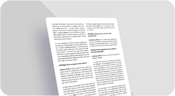 In the last few decades, researchers have massively in- In the future, quantum dots or nanocrystals may also play creased the quantum e昀케ciency of quantum dots. This a key role in medical applications — for example, in order was initially around 5% — in other words, it took 20 to visualize certain tissues. This is another focal point of photons of excitement to produce one photon of emitted our research. light. In modern quantum dots, the e昀케ciency stands at almost 100%. In part, this improvement was achieved by SNI INSight: Does your team also work with encasing the nanocrystals in an inorganic shell — like an quantum dots? onion having di昀昀erent layers. Jonathan de Roo: We don’t work with quantum dots, It is also important to adjust the reaction conditions so but we do use non-toxic colloidal nanocrystals made of that particles reach the target size at the end of the reac- zirconium and hafnium oxide. These are close relatives tion. To obtain small quantum dots, I can obviously take of quantum dots and are produced in a similar manner. my samples right at the start of the reaction and halt crystal growth — but then I lose most of the reagents. SNI INSight: What applications are you exploring The aim is to choose components and conditions with a for these nanocrystals? view to maximizing yield by making optimum use of the starting materials. This is another area where researchers Jonathan de Roo: We want to use the nanocrystals for have made considerable progress. diagnostic imaging. SNI INSight: What are quantum dots used for? In a project with colleagues from Ghent University Hos- pital (Belgium), we’re investigating whether the crystals Jonathan de Roo: Today, quantum dots are used in nu- can be used to boost soft-tissue contrast in X-ray exam- merous areas. For example, they are responsible for the inations. By doing so, we hope to pave the way for the brilliant colors in QLED televisions, where blue light is clear identi昀椀cation of “sentinel lymph nodes” in breast emitted by a gallium nitride light source and then con- cancer patients during surgery. To this end, the nanocrys- verted into green and red by the various quantum dots. tals are injected into the tumor, the liquid containing the These three primary colors can then be combined to pro- nanocrystals 昀氀ows through the lymph system to the 昀椀rst duce the full color palette. lymph node in the armpit, and this sentinel lymph node becomes visible in the X-ray image. As the solution carries In QLED lamps, quantum dots convert colors more e昀케- a dye, the surgeons can then visualize the sentinel lymph ciently than is the case with traditional LEDs, although nodes for removal during surgery. these QLED lamps are not yet commercially available. It is 昀椀rst necessary to improve the stability of the quantum In an SNI project, we’re working with colleagues from dots because, unlike a TV screen, an LED lamp becomes the PSI in order to use our nanocrystals to spot rejection very hot and can therefore cause the quantum dots to at an early stage in transplant patients. First, we equip “die o昀昀.” the nanocrystals with certain antibodies that bind spe- ci昀椀cally to immune cells. Then, if we add our antibody The nanocrystals from the de Roo team can be used to produce detailed images of even the 昀椀nest blood vessels in the gills of a zebra昀椀sh. (Image: Department of Chemistry, University of Basel) SNI INSight December 2023 6