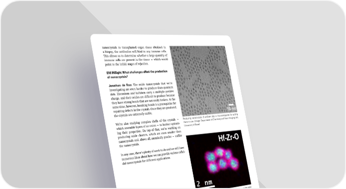 nanocrystals to transplanted organ tissue obtained in a biopsy, the antibodies will bind to any immune cells. This allows us to determine whether a large quantity of immune cells are present in the tissue — which would point to the initial stages of rejection. SNI INSight: What challenges affect the production of nanocrystals? Jonathan de Roo: The oxide nanocrystals that we’re investigating are even harder to produce than quantum dots. Zirconium and hafnium carry a multiple positive charge, and their oxides are di昀케cult to produce because they have strong bonds that are not easily broken. At the same time, however, breaking bonds is a prerequisite for repairing defects in the crystals. Once they are produced, the crystals are extremely stable. We’re also studying complex shells of the crystals — Producing nanocrystals of uniform size is the prerequisite for putting which resemble layers of an onion — to further optimiz- them to use. (Image: Department of Chemistry and Nano Imaging Lab, ing their properties. On top of that, we’re working on University of Basel) producing oxide clusters, which are even smaller than nanocrystals and, above all, atomically precise — unlike the nanocrystals. In any case, there’s plenty of work to do and we still have numerous ideas about how we can provide various colloi- dal nanocrystals for di昀昀erent applications. Jonathan de Roo’s group is investigating hafnium/zirconium oxide nano- crystals (zirconium core and hafnium shell) for use in diagnostic imaging. (Image: Department of Chemistry, University of Basel) SNI INSight December 2023 7