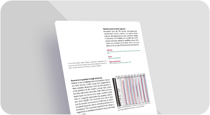 Nanostructures for better implants Researchers from the SNI network investigated how nanostructured titanium surfaces can improve dental implants. The interdisciplinary team tested the viability of osteoblasts and 昀椀broblasts and controlled how di昀昀er- ent bacterial strains colonize the modi昀椀ed surfaces. Their results were published in December 2024 in the print edition of the Journal of Biomedical Materials Research. SNI Post: https://nanoscience.unibas.ch/de/news/details/nanostrukturen-fuer-bessere-implan- tate/ Video: https://youtu.be/9yRkvlNvL2w In the Nano-Argovia project TiSpikes, researchers investigated how Original publication: nanostructured titanium surfaces improve the properties of dental im- https://onlinelibrary.wiley.com/doi/10.1002/jbm.a.37768 plants. (Image: Department of Physics, University of Basel) Reversal of magnetism through stretching Ribbons of the two-dimensional semiconductor chromi- um sulfur bromide (CrSBr) change their magnetization when stretched. Researchers from the SNI network re- cently published in the scienti昀椀c journal Nano Letters how they selectively stretch thin CrSBr ribbons of a few atomic layers and observe them using a cantilever probe with an integrated superconducting quantum interfer- ence device (SQUID). The researchers were able to show that the layered, two-dimensional CrSBr loses its antifer- romagnetic properties due to stretching and becomes a ferromagnet. The researchers reproduced this change in magnetization and domain formation using a micromag- netic model. Magnetic 昀椀eld dependence of a strained chromium sulfur bromide rib- bon (Image: Department of Physics, University of Basel) SNI post: https://nanoscience.unibas.ch/en/news/details/umkehrung-des-magnetismus-durch-deh- nung/ Original publication: https://doi.org/10.1021/acs.nanolett.4c03919 Control of skyrmions possible Using scanning SQUID microscopy at very low tempera- tures, researchers from the SNI network have visualized the microscopic structure of the magnetic phases and their transitions on the surface of the insulator Cu OSeO . 2 3 The researchers observed that under certain conditions, the surface is populated by clusters of disordered mag- netic vortex structures (skyrmions), whereby individual skyrmions could be controlled locally. SNI post: https://nanoscience.unibas.ch/en/news/details/kontrolle-von-skyrmionen-moeglich/ Using scanning SQUID microscopy at very low temperatures, research- Original publication: ers have visualized the microscopic structure of the magnetic phases https://www.nature.com/articles/s43246-024-00647-5 and their transitions on the surface of the insulator Cu OSeO . (Image: 2 3 Department of Physics, University of Basel) SNI INSight December 2024 27