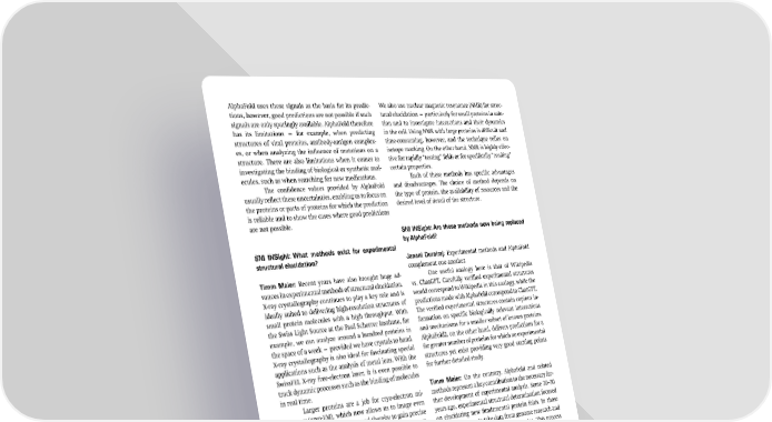 AlphaFold uses these signals as the basis for its predic- We also use nuclear magnetic resonance (NMR) for struc- tions, however, good predictions are not possible if such tural elucidation — particularly for small proteins in solu- signals are only sparingly available. AlphaFold therefore tion and to investigate interactions and their dynamics has its limitations — for example, when predicting in the cell. Using NMR with large proteins is di昀케cult and structures of viral proteins, antibody-antigen complex- time-consuming, however, and the technique relies on es, or when analyzing the in昀氀uence of mutations on a isotope marking. On the other hand, NMR is highly e昀昀ec- structure. There are also limitations when it comes to tive for rapidly “testing” folds or for speci昀椀cally “reading” investigating the binding of biological or synthetic mol- certain properties. ecules, such as when searching for new medications. Each of these methods has speci昀椀c advantages The con昀椀dence values provided by AlphaFold and disadvantages. The choice of method depends on usually re昀氀ect these uncertainties, enabling us to focus on the type of protein, the availability of resources and the the proteins or parts of proteins for which the prediction desired level of detail of the structure. is reliable and to show the cases where good predictions are not possible. SNI INSight: Are these methods now being replaced by AlphaFold? SNI INSight: What methods exist for experimental structural elucidation? Janani Durairaj: Experimental methods and AlphaFold complement one another. Timm Maier: Recent years have also brought huge ad- One useful analogy here is that of Wikipedia vances in experimental methods of structural elucidation. vs. ChatGPT. Carefully veri昀椀ed experimental structures X-ray crystallography continues to play a key role and is would correspond to Wikipedia in this analogy, while the ideally suited to delivering high-resolution structures of predictions made with AlphaFold correspond to ChatGPT. small protein molecules with a high throughput. With The veri昀椀ed experimental structures contain copious in- the Swiss Light Source at the Paul Scherrer Institute, for formation on speci昀椀c biologically relevant interactions example, we can analyze around a hundred proteins in and mechanisms for a smaller subset of known proteins. the space of a week — provided we have crystals to hand. AlphaFold2, on the other hand, delivers predictions for a X-ray crystallography is also ideal for fascinating special far greater number of proteins for which no experimental applications such as the analysis of metal ions. With the structures yet exist providing very good starting points SwissFEL X-ray free-electron laser, it is even possible to for further detailed study. track dynamic processes such as the binding of molecules in real time. Timm Maier: On the contrary, AlphaFold and related Larger proteins are a job for cryo-electron mi- methods represent a key contribution to the necessary fur- croscopy (cryo-EM), which now allows us to image even ther development of experimental analysis. Some 20–30 very large protein complexes and thereby to gain precise years ago, experimental structural determination focused information about their structure. On the downside, cryo- on elucidating new fundamental protein folds. In those EM is nowhere near as fast as X-ray crystallography and days, the aim was to take data from genome research and generates incredibly large volumes of data that we have use it to explore the fold space of proteins. This process to save for a long time — which represents an enormous has long since been completed. Today, experimental struc- cost factor. tural biologists are addressing how dynamic interactions and various functional states of proteins help make cellu- lar life possible — ideally by considering proteins in their natural environment within the cell. Here, AI-generated models of the folding of individual proteins are a useful tool when it comes to recognizing certain proteins in a cell. At the same time, machine learning methods also allow researchers to design new proteins on the computer that perform very speci昀椀c tasks — such as breaking down a speci昀椀c plastic. We recently demonstrated for the 昀椀rst time in a block course how well this protein design pro- cess now works and how quickly we can arrive at astonish- ing results and completely novel proteins. Experimental structural elucidation is then needed in order to optimize the protein design and improve the design methods. In Timm Maier and his team combine experimental and computer-assisted this sense, machine learning actually creates additional methods such as AlphaFold to study isolated proteins and proteins in demand for experimental structural elucidation. cells in order to gain a better understanding of the dynamics and function in the cell. SNI INSight December 2024 7