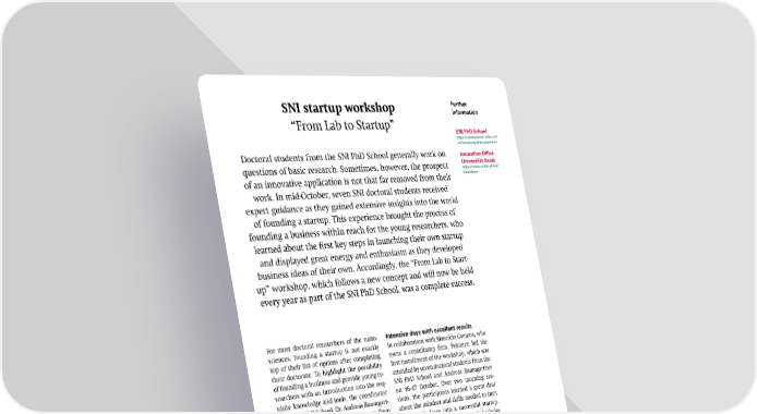 SNI startup workshop Further information “From Lab to Startup” SNI PhD School https://nanoscience.unibas.ch/ en/forschung/phd-programm/ Doctoral students from the SNI PhD School generally work on Innovation Office questions of basic research. Sometimes, however, the prospect Universität Basel https://www.unibas.ch/en/ of an innovative application is not that far removed from their Innovation/ work. In mid-October, seven SNI doctoral students received expert guidance as they gained extensive insights into the world of founding a startup. This experience brought the process of founding a business within reach for the young researchers, who learned about the 昀椀rst key steps in launching their own startup and displayed great energy and enthusiasm as they developed business ideas of their own. Accordingly, the “From Lab to Start- up” workshop, which follows a new concept and will now be held every year as part of the SNI PhD School, was a complete success. For most doctoral researchers of the nano- Intensive days with excellent results sciences, founding a startup is not exactly In collaboration with Mauricio Campos, who top of their list of options after completing owns a consultancy 昀椀rm, Pekonen led the their doctorate. To highlight the possibility 昀椀rst installment of the workshop, which was of founding a business and provide young re- attended by seven doctoral students from the searchers with an introduction into the req- SNI PhD School and Andreas Baumgartner uisite knowledge and tools, the coordinator on 16–17 October. Over two morning ses- of the SNI PhD School, Dr. Andreas Baumgart- sions, the participants learned a great deal ner, worked with Anna-Elina Pekonen from about the mindset and skills needed to turn the Innovation O昀케ce of the University of research 昀椀ndings into a successful startup. Basel to design a new concept for the short “It’s imperative that although this includes workshop “From Lab to Startup” for SNI doc- a certain willingness to take risks, the 昀氀ip toral students. side is that there’s no shame in failure and Seven SNI doctoral students showed a great deal of energy and enthusiasm as they attended the new “From Lab to Startup” course, developed in collaboration with the Innovation Of昀椀ce of the University of Basel. 24 SNI INSight December 2024