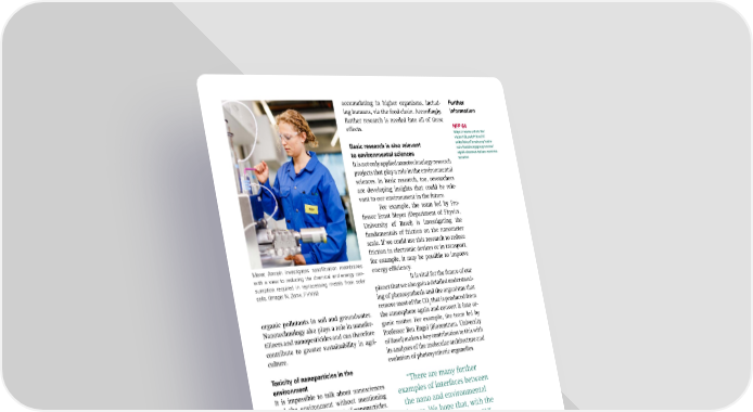 accumulating in higher organisms, includ- Further ing humans, via the food chain. Accordingly, information further research is needed into all of these e昀昀ects. NFP 64 https://www.snf.ch/de/ vbdmYGLawbfYKmOY/ Basic research is also relevant seite/fokusForschung/natio- nale-forschungsprogramme/ to environmental sciences nfp64-chancen-risiken-nanoma- It is not only applied nanotechnology research terialien projects that play a role in the environmental sciences. In basic research, too, researchers are developing insights that could be rele- vant to our environment in the future. For example, the team led by Pro- fessor Ernst Meyer (Department of Physics, University of Basel) is investigating the fundamentals of friction on the nanometer scale. If we could use this research to reduce friction in electronic devices or in transport, Meret Amrein investigates nano昀椀ltration membranes for example, it may be possible to improve with a view to reducing the chemical and energy con- energy e昀케ciency. sumption required in reprocessing metals from solar It is vital for the future of our cells. (Image: N. Zonvi, FHNW) planet that we also gain a detailed understand- ing of photosynthesis and the organisms that remove most of the CO that is produced from organic pollutants in soil and groundwater. 2 the atmosphere again and convert it into or- Nanotechnology also plays a role in nanofer- ganic matter. For example, the team led by tilizers and nanopesticides and can therefore Professor Ben Engel (Biozentrum, University contribute to greater sustainability in agri- of Basel) makes a key contribution to this with culture. its analyses of the molecular architecture and evolution of photosynthetic organelles. Toxicity of nanoparticles in the environment “There are many further It is impossible to talk about nanosciences examples of interfaces between and the environment without mentioning the environmental impact of nanoparticles. the nano and environmental There are currently no ongoing projects in sciences. We hope that, with the the SNI network that deal with these issues. research supported by the SNI, In Switzerland, they were the subject of the National Research Programme “Oppor- we can contribute to future appli- tunities and Risks of Nanomaterials” (NFP cations of nanotechnology for 64), which was carried out between 2010 the bene昀椀t of the environment.” and 2015. As part of the program, scientists sought to gain a better understanding of the opportunities and potential risks of products Prof. Martino Poggio, SNI director based on arti昀椀cial nanoparticles. Worldwide, the environmental tox- icity of nanoparticles is a matter of growing concern, as the high reactivity of these tiny particles allows them to interfere with sensi- tive ecosystems. Certain nanomaterials, such as silver or titanium dioxide nanoparticles, are demonstrably toxic to aquatic organisms. In soils, nanoparticles can also be detrimen- tal to microorganisms, plants and animals and thus interfere with the ecological bal- ance. Some nanoparticles are poorly biode- gradable and can therefore cause long-term environmental damage. There is also the risk that the particles will cause problems by 14 SNI INSight December 2024