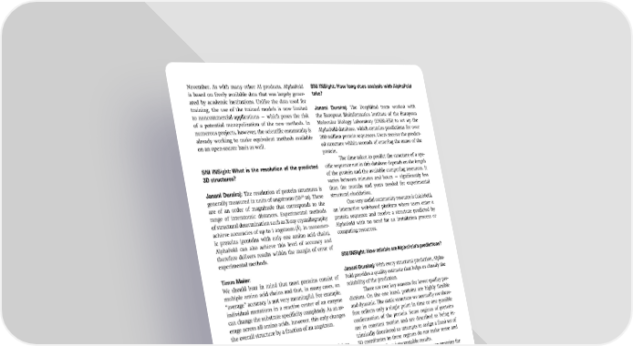 November. As with many other AI products, AlphaFold SNI INSight: How long does analysis with AlphaFold is based on freely available data that was largely gener- take? ated by academic institutions. Unlike the data used for training, the use of the trained models is now limited Janani Durairaj: The DeepMind team worked with to noncommercial applications — which poses the risk the European Bioinformatics Institute of the European of a potential monopolization of the new methods. In Molecular Biology Laboratory (EMBL-EBI) to set up the numerous projects, however, the scienti昀椀c community is AlphaFold database, which contains predictions for over already working to make equivalent methods available 200 million protein sequences. Users receive the predict- on an open-source basis as well. ed structure within seconds of entering the name of the protein. The time taken to predict the structure of a spe- SNI INSight: What is the resolution of the predicted ci昀椀c sequence not in this database depends on the length 3D structures? of the protein and the available computing resources. It varies between minutes and hours — signi昀椀cantly less Janani Durairaj: The resolution of protein structures is than the months and years needed for experimental 10 structural elucidation. generally measured in units of angstroms (10- m). These are of an order of magnitude that corresponds to the One very useful community resource is ColabFold, range of interatomic distances. Experimental methods an interactive web-based platform where users enter a of structural determination such as X-ray crystallography protein sequence and receive a structure predicted by achieve accuracies of up to 1 angstrom (Å). In monomer- AlphaFold with no need for an installation process or ic proteins (proteins with only one amino acid chain), computing resources. AlphaFold can also achieve this level of accuracy and therefore delivers results within the margin of error of experimental methods. SNI INSight: How reliable are AlphaFold’s predictions? Timm Maier: Janani Durairaj: With every structural prediction, Alpha- We should bear in mind that most proteins consist of Fold provides a quality estimate that helps us classify the multiple amino acid chains and that, in many cases, an reliability of the prediction. “average” accuracy is not very meaningful. For example, There are two key reasons for lower quality pre- individual mutations in a reactive center of an enzyme dictions. On the one hand, proteins are highly 昀氀exible can change the substrate speci昀椀city completely. As an av- and dynamic. The static structure we normally see there- erage across all amino acids, however, this only changes fore re昀氀ects only a single point in time or one possible the overall structure by a fraction of an angstrom. conformation of the protein. Some regions of proteins are in constant motion and are described as being in- trinsically disordered so attempts to assign a 昀椀xed set of SNI INSight: You’ve mentioned huge amounts of data. 3D coordinates to these regions do not make sense and What sort of scale are we talking about? would not produce interpretable results. On the other hand, there are many proteins for Janani Durairaj: If we consider all possible 3D confor- which only a few coevolutionary signals exist. Since mations that a protein can adopt, we’re talking about an astronomical number of possible conformations. For example, even with some underestimations, a protein with 100 amino acids could theoretically result in over 198 3 di昀昀erent conformations. It is therefore impossible to enumerate these conformations as an algorithmic solu- tion for predicting protein structures. Seen from another perspective, the “se- quence-structure gap” means that although sequencing projects operating around the world have provided mil- lions of protein sequences from wide-ranging organisms, researchers have only determined hundreds of thousands of empirical protein structures. This is because each structure can take years of complex studies to solve. By learning from these sequences and structures, AlphaFold allows high-accuracy predictions for many mil- lions of sequences, bringing us much closer to closing the Janani Durairaj, who is setting up her own research group as an Ambi- gap with plausible hypotheses. zione fellow, has worked intensively on the creation of the “Protein Uni- verse Atlas”. This is a web service that allows users to navigate through a universe of millions of known proteins. SNI INSight December 2024 6