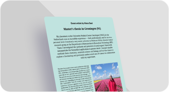 Guest article by Alexa Dani Master’s thesis in Groningen (NL) My placement at the University Medical Center Groningen (UMCG) in the Netherlands was an incredible experience — both professionally and for me on a personal level. I received a very warm welcome to Professor Hélder Almeida Santos’ research group at the Department of Biomaterials & Biomedical Technology (BBT). There, I investigated the synthesis and potential of metal-organic framework nanoparticles for biomedical applications in greater detail. I learned valuable methods from chemistry, materials science and biology and had the chance to explore a fascinating and previously undiscovered area of science in collaboration with my supervisors. The aim of my master’s thesis was to synthesize wide-rang- ing nanoparticles with a metal-organic framework (MOF NPs), which have received growing attention over recent years due to their porosity and excellent modi昀椀cability. The particles were then to be tested on macrophages — vi- tal immune cells that can switch into a pro- or anti-in昀氀am- matory state depending on external stimuli. In昀氀uencing this “polarization” from the outside could represent an innovative treatment approach in the event of immune dysfunction. The key aim of my master’s thesis was there- fore to test the e昀昀ect of MOF NPs with di昀昀erent compo- sitions, crystallinities and shapes on the polarization of macrophages. A further objective was to integrate these MOF NPs into polymer-based dissolvable microneedle (dMN) patches, which are being developed as a painless, transdermal means of drug administration. The project fully met my de昀椀nition of “medical nanosciences,” as it combined aspects of chemistry, mate- rials science and biology in a biomedical application and therefore required interdisciplinary thinking. It was also a special experience to collaborate on a project that had been the subject of very little research so far and that was Almost endless 昀椀elds of tulips near the Dollard. also new to my supervisors. This a昀昀orded me consider- able in昀氀uence over the project. and e昀昀ectiveness of my system using a series of analytical In the 昀椀rst phase of my master’s thesis, I focused techniques. on the synthesis and characterization of the MOF NPs, Overall, we succeeded in synthesizing MOF working with experts to produce electron microscope im- nanoparticles with our desired physico-chemical proper- ages and evaluate the crystal structure of the nanoparti- ties for potential biomedical applications. Moreover, we cles. I also evaluated the size and surface properties of the demonstrated that these nanoparticles can be incorporat- MOF NPs using dispersion-based particle characterization ed into the patches. methods. The second phase involved the production of During my time at the UMCG, I felt very welcome transdermal patches, which helped me deepen my under- and appreciated in Professor Santos’ research group and at standing of biomaterials. Above all, I learned a lot about BBT. I particularly valued the research group’s collabora- the strict requirements that these materials have to meet tions both within and beyond the department, which will for biomedical applications. Lastly, I worked with cell hopefully also lead to future partnerships between the cultures — particularly macrophages — to test the safety Swiss Nanoscience Institute and the UMCG. The weekly SNI INSight December 2024 18