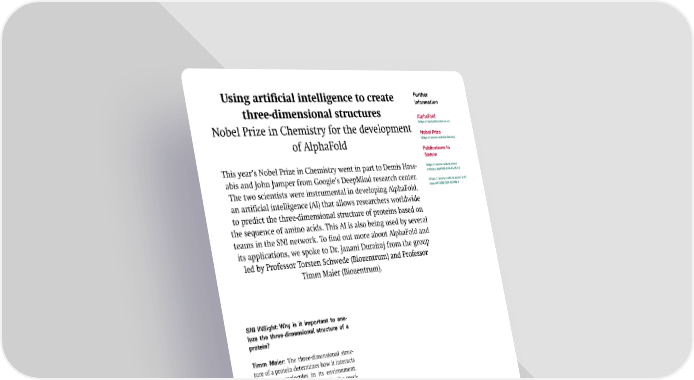 Using arti昀椀cial intelligence to create Further information three-dimensional structures AlphaFold Nobel Prize in Chemistry for the development https://alphafold.ebi.ac.uk Nobel Prize of AlphaFold https://www.nobelprize.org Publications in Nature This year’s Nobel Prize in Chemistry went in part to Demis Hass- https://www.nature.com/ articles/d41586-019-01357-6 abis and John Jumper from Google’s DeepMind research center. https://www.nature.com/arti- The two scientists were instrumental in developing AlphaFold, cles/d41586-024-03708-4 an arti昀椀cial intelligence (AI) that allows researchers worldwide to predict the three-dimensional structure of proteins based on the sequence of amino acids. This AI is also being used by several teams in the SNI network. To 昀椀nd out more about AlphaFold and its applications, we spoke to Dr. Janani Durairaj from the group led by Professor Torsten Schwede (Biozentrum) and Professor Timm Maier (Biozentrum). SNI INSight: Why is it important to ana- lyze the three-dimensional structure of a protein? Timm Maier: The three-dimensional struc- ture of a protein determines how it interacts with other molecules in its environment. This structure is a key element in the speci- 昀椀city, activity and regulation of proteins. In the case of an enzyme, for example, the shape of the binding site must perfectly match the substrate to which it binds. If the shape of an enzyme changes, the catalyzed re- action can be blocked. The three-dimensional structure is also crucial for the formation of larger protein complexes and for proteins that ful昀椀ll other functions. If it changes due Timm Maier explains why the three-dimensional struc- to mutations, chemical modi昀椀cations or en- ture of a protein is so important. vironmental in昀氀uences, this can have serious consequences for the function of the protein and thus for the entire organism. Knowledge of the protein structure SNI INSight: What did the Nobel Prize win- helps researchers when it comes to devel- ners Demis Hassabis and John Jumper oping drugs that interact with proteins and develop? either block or intensify their activity or to developing proteins with new or improved Janani Durairaj: The two researchers have functions. contributed signi昀椀cantly to the development of the arti昀椀cial intelligence AlphaFold2, which can predict the spatial structure of proteins of which only the amino acid se- quence is known. 4 SNI INSight December 2024