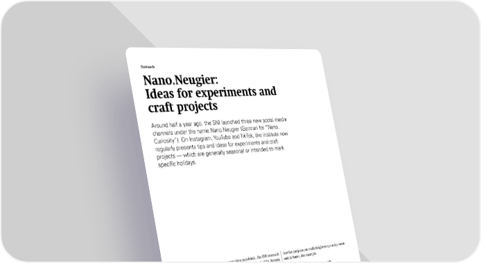 During the coronavirus pandemic, the SNI outreach team — which at that time consisted of Dr. Kerstin Beyer-Hans, Dr. Michèle Wegmann and Dr. Christel Möller — began to produce short videos on experi- ments to carry out at home. The aim here was to present and explain various scientific phenomena in an accessible and entertaining way. With Nano.Neugier, these activities now have their own channels on Instagram, TikTok and YouTube. As well as the experiments, there are also numerous step-by-step guides for fun craft projects that can brighten a day or even make an ideal gift. For exam- ple, new content in recent weeks included numerous seasonal origami projects. On a regular basis, out- reach manager Beyer-Hans also posts various small experiments that can be carried out at home using ordinary household materials as an easy and exciting way of demonstrating the fundamental laws of the natural sciences. “With the Nano.Neugier channels, we want to provide entertaining activities for families,” she ex- plains. From her own experience, Beyer-Hans knows Further informationen: Nano.Neugier Instagram Nano.Neugier YouTube Nano.Neugier TikTok Further SNI social media channels: LinkedIn YouTube Bluesky Instagram Outreach Nano.Neugier: Ideas for experiments and craft projects Around half a year ago, the SNI launched three new social media channels under the name Nano.Neugier (German for “Nano. Curiosity”). On Instagram, YouTube and TikTok, the institute now regularly presents tips and ideas for experiments and craft projects — which are generally seasonal or intended to mark specific holidays. that fun projects can really brighten up a rainy week- end at home, for example. A complement to existing channels With families as its target audience, Nano.Neugier has a different offer from the existing SNI channels. Current and future students are addressed via the Instagram channel “nano_study_sni,” while the YouTube channel “Swiss Nanoscience Institute” pro- vides videos on nanoresearch at the SNI as well as the nanoscience program, events and the PhD School. Lastly, we use LinkedIn and the relatively new Bluesky channel of the SNI to provide regular information on the latest developments from our network. Across all our channels, we’re always delighted to welcome new followers and hear their many com- ments and suggestions. 30 SNI INSight December 2025