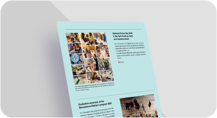 National Future Day 2025 A day full of energy, light, and nanostructures On 13 November, the National Future Day, the Swiss Nanoscience Institute (SNI), the Department of Physics and the Basel Quantum Center (BQC) opened the doors to 20 girls aged 10 to 13. A varied program offered the participants exciting in- sights into the world of physics, quantum and nano- science. SNI post Our visitors participated enthusiastically and with great fun in the activities planned for the National Future Day 2025, learning a great deal about phys- ics and nanotechnology. Graduation ceremony of the Nanoscience Master’s program 2025 On 7 November, the graduation ceremony of the Na- noscience Master’s program 2025 took place at the Basel Papiermühle – a festive and joyful occasion where the graduates received their well-earned diplo- mas and celebrated their achievements together. This year, the master’s degree ceremony for the nano studies program took place at the Papiermühle in Basel. SNI post Video Dieses Jahr fand die Masterfeier für das Nanostudium in der Basler Papier- mühle statt. 37 SNI INSight December 2025