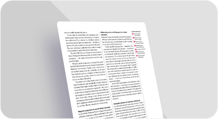 Further information: Research group Oliver Wenger Research group Martino Poggio Research group Tomasz Smoleński Research group Richard Warburton Uni News PHOQUS Research group Dominik Zumbühl Interreg Project UpQuantVal Influencing and controlling quantum states with light Professor Tomasz Smoleński joined the Department of Physics at the University of Basel in early 2025 and has recently been awarded both an ERC Starting Grant and an SNSF Spark project. Within the ERC Starting Grant — funded for five years and set to begin in January 2026 — researchers in the Smoleński Group will investigate how light can selectively modify the properties of novel quan- tum materials. The studied van der Waals hetero- structures consist of only a few atomic layers and host collective electronic states that behave as if ex- posed to an extremely strong artificial magnetic field, even though no real magnetic field is applied. The project aims to understand how light can influ- ence and control these sensitive quantum states. In the long term, these insights are expected to open new pathways for the optical control of quantum phases — a key step toward future quantum and nanotechnologies. In the SNSF Spark project, the Smoleński team will implement a novel quantum-optical interface for sensing the dynamics of electrons forming exotic states in two-dimensional materials. This approach could provide a revolutionary photonic platform en- abling ultrafast access to emergent quantum phases of matter. Entangled photons for quantum technology An international team involving Professor Richard Warburton from the Department of Physics at the University of Basel has recently been awarded a pres- tigious European Research Council (ERC) Synergy Grant. In this project, the researchers aim to create entangled photons for applications in quantum com- puting and quantum communication. The entangled photons will be created using advanced semiconduc- tors. Until now, only single photons could be used in quantum communication to transmit information over long distances or as the smallest unit of a quan- tum computer (qubit). The more photons are used, the more complicated and expensive the hardware becomes. In the PHOQUS project, which has now been ap- proved for 6 years as part of the EU’s Horizon Europe program, the researchers aim to create so-called “photonic resource states” – groups of at least three photons that are entangled with each other. These resource states can be used at the inputs of a pho- tonic chip and are predicted to be much more scal- able than single photons. The research is being conducted jointly by teams in Basel, Bochum, and Copenhagen. In Bochum, new semiconductors, notably quantum dots, will be de- veloped. In Basel, the new semiconductors will be tested and the first device prototypes built, while in Magnetic properties of van der Waals materials In April 2026, Professor Martino Poggio (Department of Physics, University of Basel) will launch a four-year SNSF project. As part of this work, his team will in- vestigate extremely thin magnetic materials known as van der Waals magnets, which are made up of just one or a few atomic layers. The goal is to understand how the magnetic prop- erties change if a material becomes this thin. Al- though magnetism is well understood in macro- scopic systems, so-called “low-dimensional” magne- tism and the mechanisms that stabilize it continue to defy expectation. Perhaps more importantly, the researchers are excited to explore how these mate- rials can be engineered into magnetic devices with new functionality. To investigate these systems, the team will have to develop extremely sensitive mag- netic imaging techniques capable of resolving the tiny magnetic fields produced by single atomic lay- ers. These include scanning probes based on nano- magnetometers or ultrasensitive mechanical oscil- lators that can map magnetic fields on the scale of just a few nanometers. Ultimately, the researchers aim to improve our understanding of magnetism and to assess how van der Waals materials could be used for future applications in ultra-small magnetic com- ponents or memory. also be readily absorbed by plants. To this end, the researchers will reprogram me- talloenzymes from bacteria and archaea to catalyze the oxidation of N2 to nitrate. As a fertilizer, nitrate has several advantages over ammonia — and the ox- idation of N2 also requires less energy than reduction. The new technique could therefore reduce energy consumption in agriculture in the long term. The other ERC Advanced Grant went to Professor Oliver Wenger for his research in the field of photo- chemistry — the study of chemical reactions trig- gered by light. Wenger and his team want to expand the poten- tial of photochemistry by overcoming a fundamental limitation: According to “Kasha’s rule,” only the low- est excited energy state of a molecule can be used for chemical reactions. As higher excited states lose their energy too quickly, there has so far been no way to use them effectively. The project now being funded aims to overcome these boundaries and specifically initiate chemical reactions from higher excited states. To this end, the researchers are pursuing two approaches: They want to slow down energy loss from these states while also increasing the reaction speed so that reactions take place faster than energy is lost. If they succeed in carrying out these reactions reliably, their work could drive significant advances in both synthetic chemis- try and the efficient conversion of solar energy. 16 SNI INSight December 2025