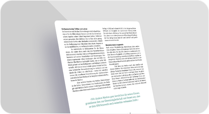 Enthusiastischer Tüftler und Lehrer So lag er 2022 nach einem Unfall in den Bergen auf dem Im Interview mit Markus Dürrenberger wird schnell klar, OP-Tisch im Unispital. Der operierende Chirurg lachte wie er für die Mikroskopie brennt und wie ihn die techni- ihn mit einem «Ich kenne Sie» an und berichtete darauf- schen Aspekte seiner Arbeit begeistert haben. Während hin, dass er vor vielen Jahren den Mikroskopie-Blockkurs seines gesamten Berufslebens war es ihm nicht genug, bei ihm belegt hatte und sich noch lebhaft und positiv existierende Geräte oder Methoden anzuwenden. Sobald daran erinnern konnte. er die Bedienung einer Maschine intus hatte, begann er sie zu modi昀椀zieren, zu verbessern und zu erweitern. Weiterhin keine Langeweile So entwickelte er Kühlsysteme für die Mikro- Nach seiner Pensionierung übernehmen jetzt andere skope, die später dann auch von den Hersteller昀椀rmen diese Aufgaben. Markus Dürrenberger bleibt aber weiter- übernommen wurden. Und auch Präparationsmaschinen hin sehr aktiv. Für das SNI arbeitet er stundenweise mit basieren auf seinen Vorarbeiten und Neuerungen. Von dem Museum Burghalde in Lenzburg zusammen, um in einem sogenannte «Glow discharger», der mit Hilfe von die Dauerausstellung nanowissenschaftliche Aspekte zu Plasma Ober昀氀ächen hydrophil macht, hat er selbst 100 integrieren. Daneben setzt sich Markus weiterhin in der Stück gebaut und an Kolleginnen und Kollegen weltweit Pensionskasse Basel-Stadt ein und kandidiert dort für den verteilt. «Mir hat es immer wieder grosse Freude bereitet, Verwaltungsrat. eine technische Herausforderung zu meistern und uns Und dann hat Markus noch eine Familie und damit die Arbeit zu erleichtern – wobei ich natürlich diverse Hobbies. Vier erwachsene Söhne und seine lang- immer die exzellente Unterstützung der mechanischen jährige Partnerin Dominique freuen sich, wenn er nun und elektrischen Werkstatt in Anspruch nehmen durfte», etwas mehr Zeit mit ihnen verbringen kann. So gehen bemerkt Markus. sie miteinander in die Berge oder zum Tauchen ans Meer. Eine weitere Passion von Markus Dürrenberger Denn Wasser – ob als Schnee oder in 昀氀üssiger Form – ge- ist die Lehre. Generationen von Studierenden der Biolo- hören zu Markus` Leidenschaften (er war mal Schweizer gie und Medizin haben seinen 3-wöchigen Mikroskopie- Meister im 100 m Brustschwimmen). Und alle, die Markus Blockkurs absolviert und erinnern sich noch heute daran. ein bisschen kennen, wissen, dass auch sein Motorrad nicht lange stillsteht. «Wir danken Markus ganz herzlichen für seinen Einsatz, gratulieren ihm zur Ehrenmitgliedschaft und freuen uns, dass er dem SNI-Netzwerk auch weiterhin verbunden bleibt.» Nano Fabrication Lab Die Serviceeinheit wächst Zwei neue Mitarbeitende sind im November 2023 zum Team des Nano Fabrication Labs gestossen. Juri Herzog und Xavier Wildermuth unterstützen von nun an Dr. Gerard Gadea und Arnold Lücke. Zusammen werden die vier Mitarbeitenden die Serviceleistungen im Bereich Nanofabrikation weiter ausbauen. Das im Sommer 2022 gegründete Nano Fabrication Lab nen. Sie arbeiten beide zu 60% und freuen sich auf die neu- (NF Lab) bietet Forschungsgruppen und Partnern aus der en Herausforderungen im Bereich der Nanofabrikation. Industrie umfassende Dienstleistungen und Unterstüt- Juri hat zunächst eine Uhrmacher-Ausbildung ab- zung im Bereich der Nanofabrikation. Um die Gruppe solviert und dann während der Beschäftigung bei Oris ein zu stärken und der gesteigerten Nachfrage gerecht zu Masterstudium in Mikro- und Nanotechnologie begonnen. werden, bekamen der Leiter des NF Labs, Dr. Gerard Ga- Es folgte ein Wechsel ans CSEM, wo Juri die Masterarbeit dea, und der bisher einzige Techniker Arnold Lücke nun schrieb und dann neun Jahre lang als Techniker:in tätig Unterstützung. war. Über eine CAS-Weiterbildung hat sich Juri auch einen Juri Herzog und Xavier Wildermuth haben ihre vertieften Einblick in Themenschwerpunkte wie Umwelt Anstellung im NF Lab-Team am 1. November 2023 begon- und Entwicklung verscha昀昀t und diesen genutzt, um zeit- SNI INSight Dezember 2023 12