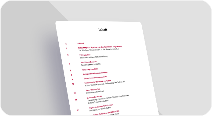 Inhalt 3 Editorial 4 Entdeckung und Synthese von Quantenpunkten ausgezeichnet Der Nobelpreis für Chemie geht an drei Nanowissenschaftler 8 PSI-Impuls-Preis Thomas Mortelman erhält Auszeichnung 8 SNI-Doktorandenschule Bewerbungen noch möglich 9 Nano Image Award 2023 9 Vortragsreihe zu Nanowissenschaften 9 Grenzen in den Nanowissenschaften 10 Leidenschaft für Mikroskopie und Technik Markus Dürrenberger erhält die Ehrenmitgliedschaft des SNI 12 Nano Fabrication Lab Die Serviceeinheit wächst 14 Zurück zu den Wurzeln Die ehemalige Nanostudentin Anne Géraldine Guex kommt als Professorin zurück nach Basel 17 Projekte im Quantum Transitional Call Beteiligung von SNI-Mitgliedern 20 Gastbeitrag: Rückblick auf die INASCON 2023 Eine von Studierenden organisierte «Reise» 22 Unterstützung mit detailgenauen Bildern Das Nano Imaging Lab ist begehrter Anlaufpunkt für Maturaarbeiten 25 Neuigkeiten aus dem SNI-Netzwerk