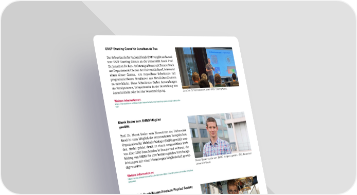 SNSF Starting Grant für Jonathan de Roo Der Schweizerische Nationalfonds (SNF) vergibt sechs wei- tere SNSF Starting Grants an die Universität Basel. Prof. Dr. Jonathan De Roo, Assistenzprofessor mit Tenure Track am Departement Chemie der Universität Basel, bekommt einen dieser Grants, um recycelbare Schwämme mit programmierbaren Strukturen aus Metall-Oxo-Clustern zu entwickeln. Diese Schwämme 昀椀nden Anwendungen als Katalysatoren, beispielsweise in der Herstellung von Arzneimitteln oder bei der Wasserreinigung. Jonathan de Roo bekommt einen SNSF Starting Grant. Weitere Informationen: https://nanoscience.unibas.ch/de/news/details/snsf-starting-grant-fuer-jonathan-de- roo/ Marek Basler zum EMBO Mitglied gewählt Prof. Dr. Marek Basler vom Biozentrum der Universität Basel ist zum Mitglied der renommierten Europäischen Organisation für Molekularbiologie (EMBO) gewählt wor- den. Basler gehört damit zu einem ausgewählten Kreis von über 2000 Forschenden in Europa und weltweit, die bislang von EMBO für ihre herausragenden Forschungs- leistungen mit einer lebenslangen Mitgliedschaft gewür- digt wurden. Marek Basler wurde zum EMBO Mitglied gewählt. (Bild: Biozentrum Universität Basel) Weitere Informationen: https://www.biozentrum.unibas.ch/de/news/detail/marek-basler-zum-embo-mitglied- gewaehlt Dominik Zumbühl zum American Physical Society Fellow gewählt Prof. Dr. Dominik Zumbühl (Departement Physik, Uni- versität Basel, und Direktor des NCCR Spin) bekommt die Auszeichnung verliehen «für Quantentransportex- perimente in Halbleiter-Nanostrukturen bei tiefen Tem- peraturen zur Untersuchung von Kohärenz, Spins und Spin-Bahn-Kopplung, einschliesslich der Entwicklung und des Einsatzes von Laborinstrumenten.» Weitere Informationen: Dominik Zumbühl wurde zum Fellow der American Physical Society https://nanoscience.unibas.ch/de/news/details/dominik-zumbuehl-zum-american- gewählt. (Bild: NCCR Spin) physical-society-fellow-fuer-2023-gewaehlt/ NZZ Reportage: Quantum Computing Eine im September erschienene NZZ Reportage befasst sich eingehend mit dem Quantencomputing und zeigt sowohl das grenzenlose Potenzial als auch die mit dieser bahnbrechenden Technologie verbundenen Risiken auf. Weitere Informationen: https://physik.unibas.ch/de/news/details/nzz-reportage-quantum-computing/ SNI INSight Dezember 2023 27